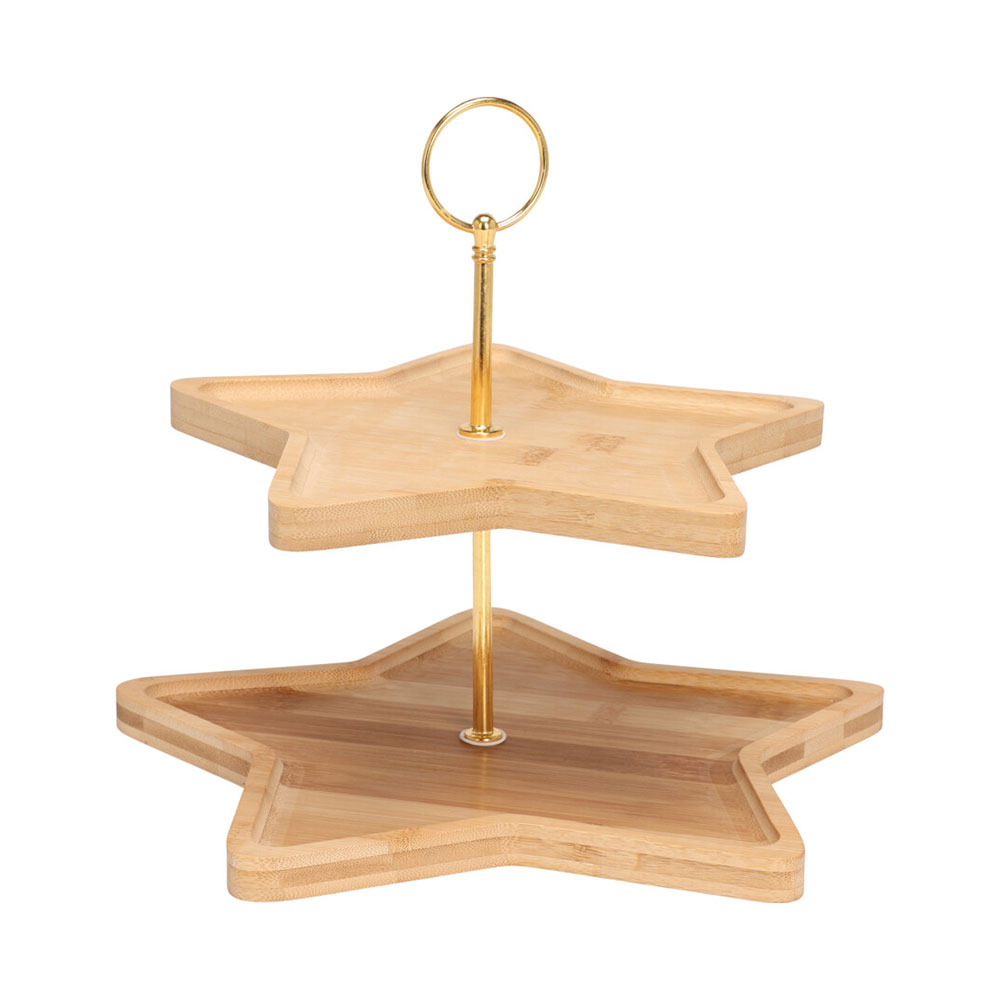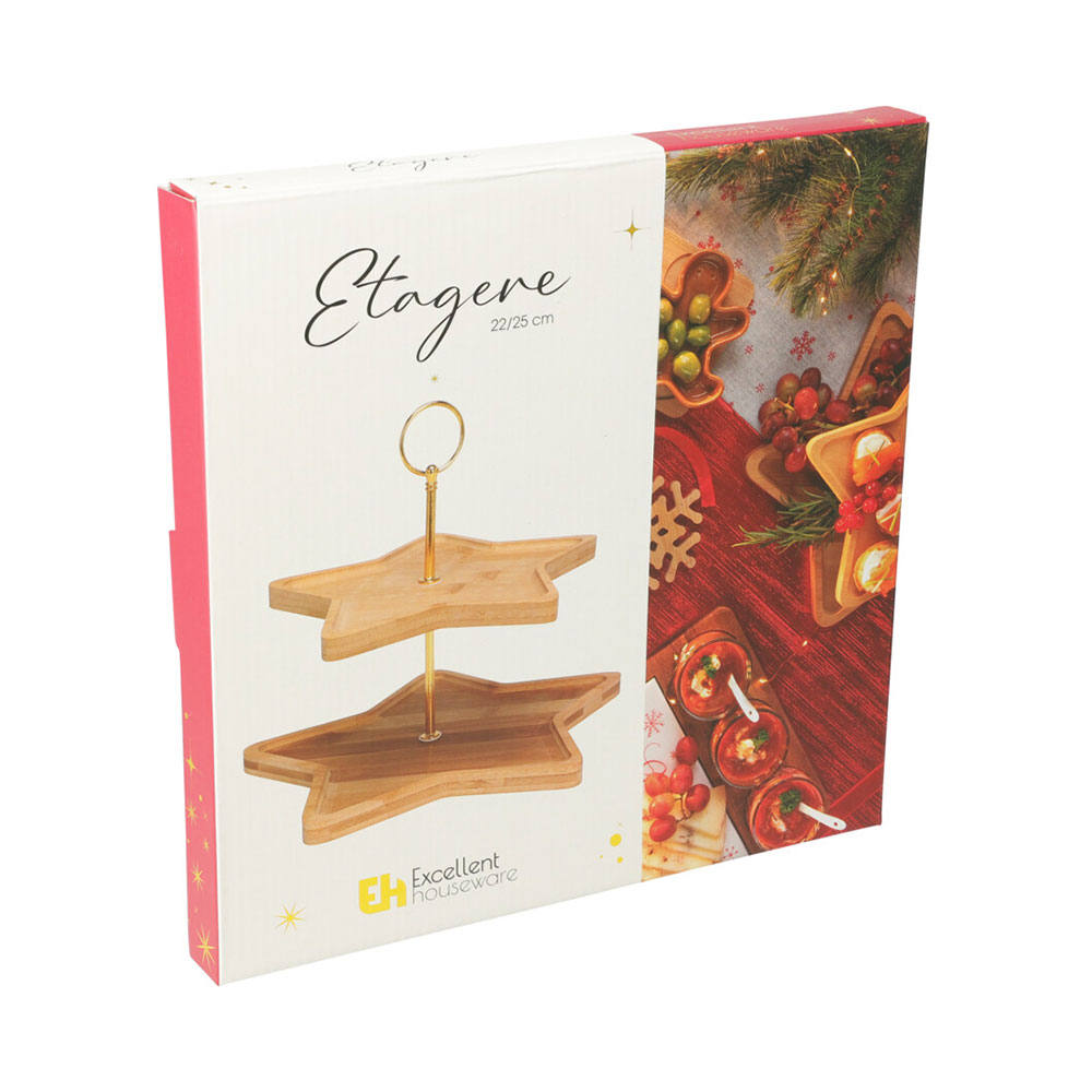Ορντεβιέρα σερβιρίσματος διώροφη με επιφάνειες σε σχήμα αστεριού. Είναι κατασκευασμένη από bamboo κατάλληλο για τρόφιμα σε φυσικό χρώμα και έχει χρυσή μεταλλική λαβή για εύκολη μεταφορά. Προσθέτει μια κομψή χριστουγεννιάτικη πινελιά, ιδανική για να σερβίρετε γλυκά, μπισκότα, τυριά ή finger food με στυλ. Ένα κομμάτι που φέρνει οικογενειακή θαλπωρή στο επίκεντρο των γιορτινών σας στιγμών.