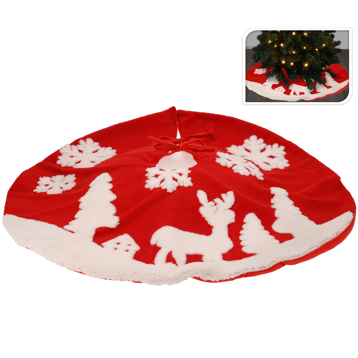 Ποδιά δέντρου σε κόκκινο χρώμα με λευκές λεπτομέρειες και χριστουγεννιάτικο σχέδιο. Είναι κατασκευασμένη από απαλό ύφασμα polyester και διαθέτει κορδονάκια για να δένει. Έχει διάμετρο 85εκ. Μπορείτε να την τοποθετήσετε κάτω από το χριστουγεννιάτικο δέντρο για να κρύψετε ανεπιθύμητα καλώδια και τη βάση του.
