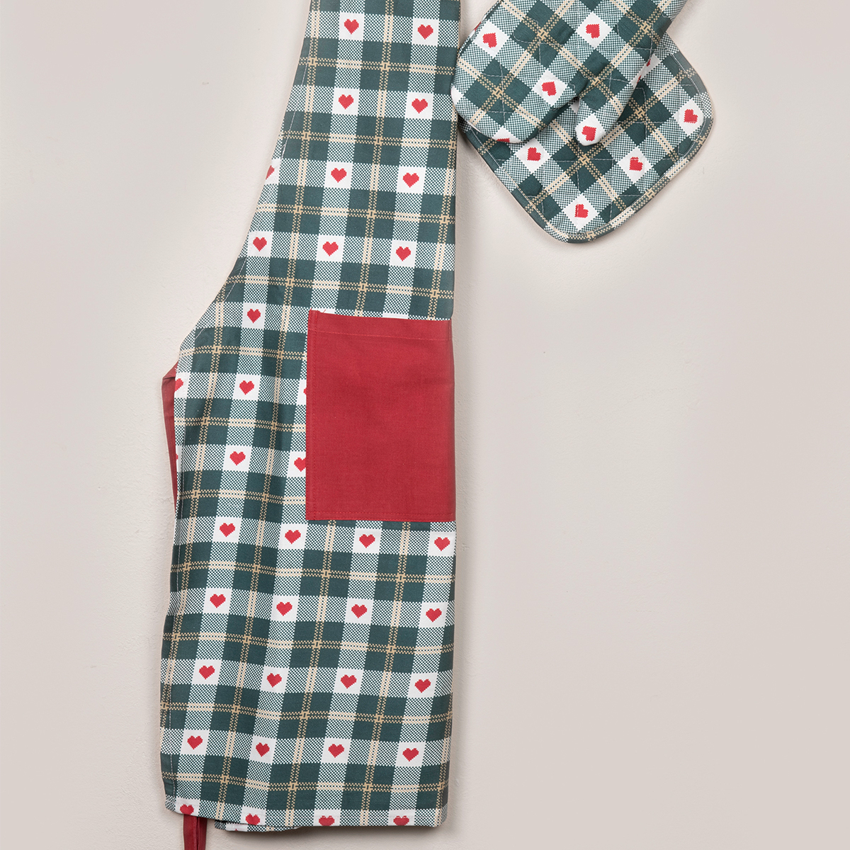 Χριστουγεννιάτικη ποδιά κουζίνας σε πράσινο χρώμα, με κόκκινες λεπτομέρειες και καρό σχέδιο από την εταιρεία Nima. Το ύφασμα είναι από 100% βαμβάκι 180gsm. Συνδυάστε την με τα υπόλοιπα προϊόντα της συλλογής για ένα ολοκληρωμένο γιορτινό αποτέλεσμα.