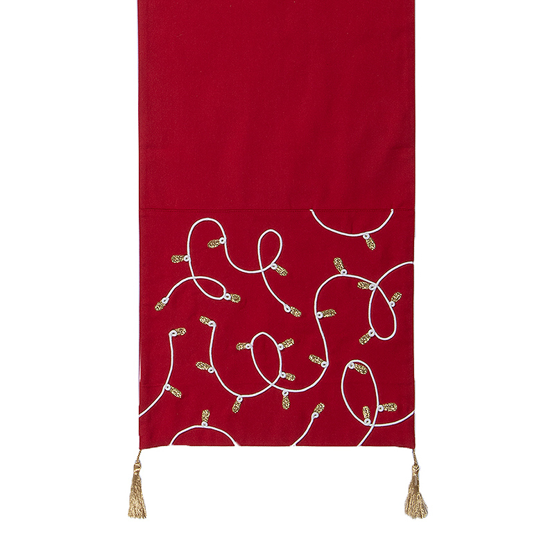 Χριστουγεννιάτικο runner από την εταιρεία Nef-Nef σε κόκκινο χρώμα με λευκές και χρυσές λεπτομέρειες. Στο τελείωμα έχει χρυσές διακοσμητικές φουντίτσες. Η σύνθεσή του είναι 100% βαμβάκι. Συνδυάστε το με τα υπόλοιπα προϊόντα της συλλογής για ένα ολοκληρωμένο αποτέλεσμα.