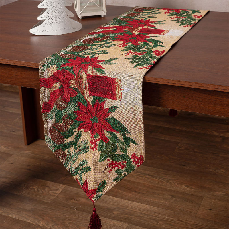 Χριστουγεννιάτικο runner από την εταιρεία Silk Fashion. Έχει μπεζ χρώμα, Χριστουγεννιάτικο σχέδιο με κόκκινες-πράσινες λεπτομέρειες και διακοσμητικές φούντες. Είναι κατασκευασμένο από στιβαρό ύφασμα 50% βαμβάκι - 50% Polyester. Ιδανικό για να στολίσετε τον χώρο σας τις γιορτές.