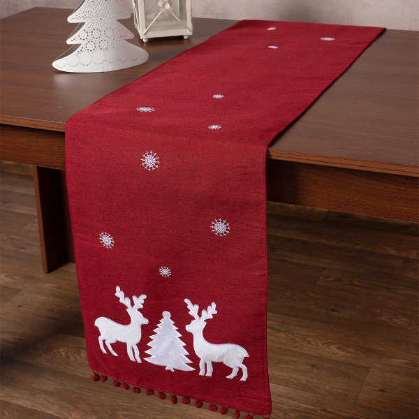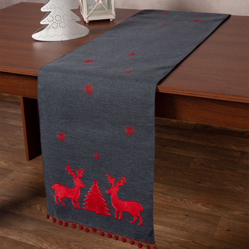 Χριστουγεννιάτικο runner από την εταιρεία Silk Fashion. Έχει γκρι χρώμα, απλικέ σχέδιο και πον πον. Είναι κατασκευασμένο από 50% βαμβάκι - 50% Polyester. Ιδανικό για να στολίσετε τον χώρο σας τις γιορτές.