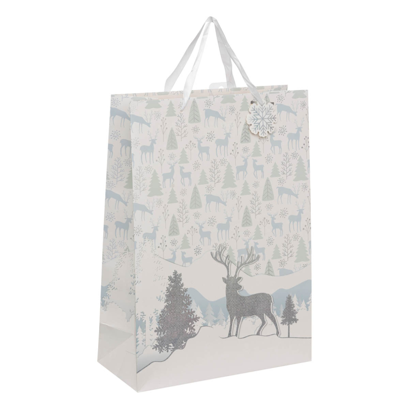 Μεγάλη τσάντα δώρου χάρτινη σε λευκό και ασημί χρώμα με χριστουγεννιάτικο σχέδιο. Έχει χερούλια από σατέν κορδέλα σε λευκό χρώμα και κάρτα για ευχές.