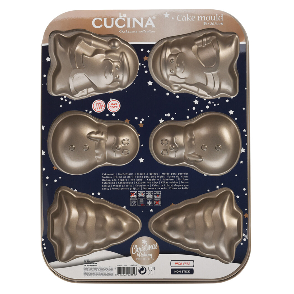 Φόρμα ζαχαροπλαστικής 6 θέσεων για κεκάκια σε σχήμα Αγίου Βασίλη, χιονάνθρωπου και χριστουγεννιάτικου δέντρου. Είναι κατασκευασμένη από αντικολλητικό μεταλλικό υλικό σε ασημί χρώμα. Δεν επιτρέπεται η τοποθέτηση σε φούρνο μικροκυμάτων. Μέγιστη θερμοκρασία αντοχής 230 C.