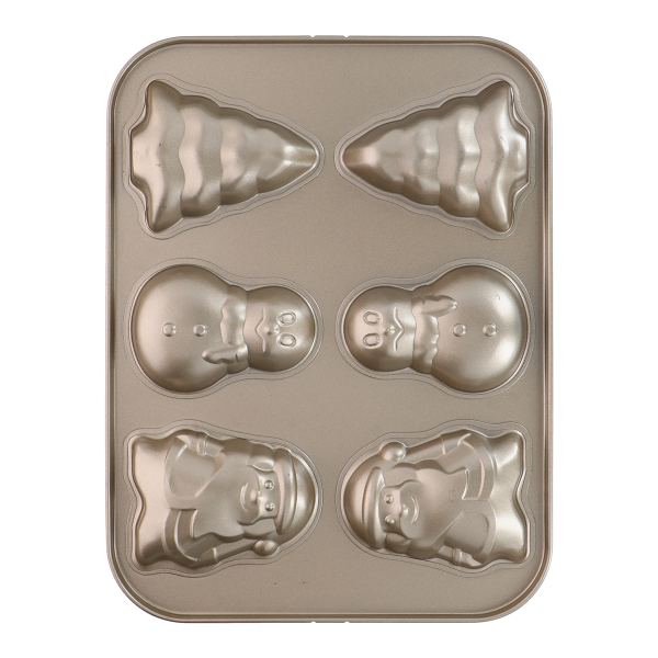 Φόρμα ζαχαροπλαστικής 6 θέσεων για κεκάκια με 3 χριστουγεννιάτικα σχέδια από την εταιρεία Alpina. Είναι κατασκευασμένη από αντικολλητικό μεταλλικό υλικό σε χρυσό χρώμα. Επιτρέπει την εύκολη απελευθέρωση του ζυμαριού και το εύκολο καθάρισμα μετά τη χρήση. Δεν επιτρέπεται η τοποθέτηση σε φούρνο μικροκυμάτων. Χρησιμοποιήστε Χριστουγεννιάτικα είδη κουζίνας για να προσφέρετε γιορτινή διάθεση.