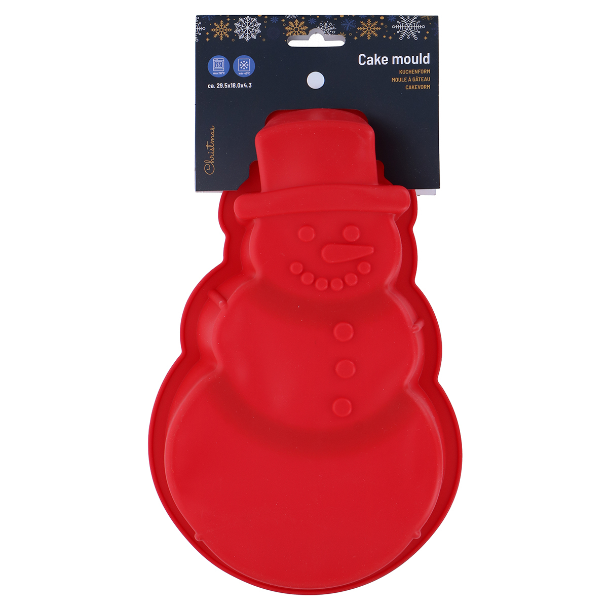 Φόρμα ζαχαροπλαστικής για κέικ με Χριστουγεννιάτικο σχέδιο από την εταιρεία Alpina. Είναι κατασκευασμένη από σιλικόνη σε κόκκινο χρώμα με σχέδιο χιονάνθρωπου. Επιτρέπει το εύκολο ξεφορμάρισμα και καθάρισμα μετά τη χρήση. Δεν επιτρέπεται η τοποθέτηση σε φούρνο μικροκυμάτων. Χρησιμοποιήστε Χριστουγεννιάτικα είδη κουζίνας για να προσφέρετε γιορτινή διάθεση. Μέγιστη θερμοκρασία φούρνου 210°C και κατάλληλο για κατάψυξη έως -40°C.