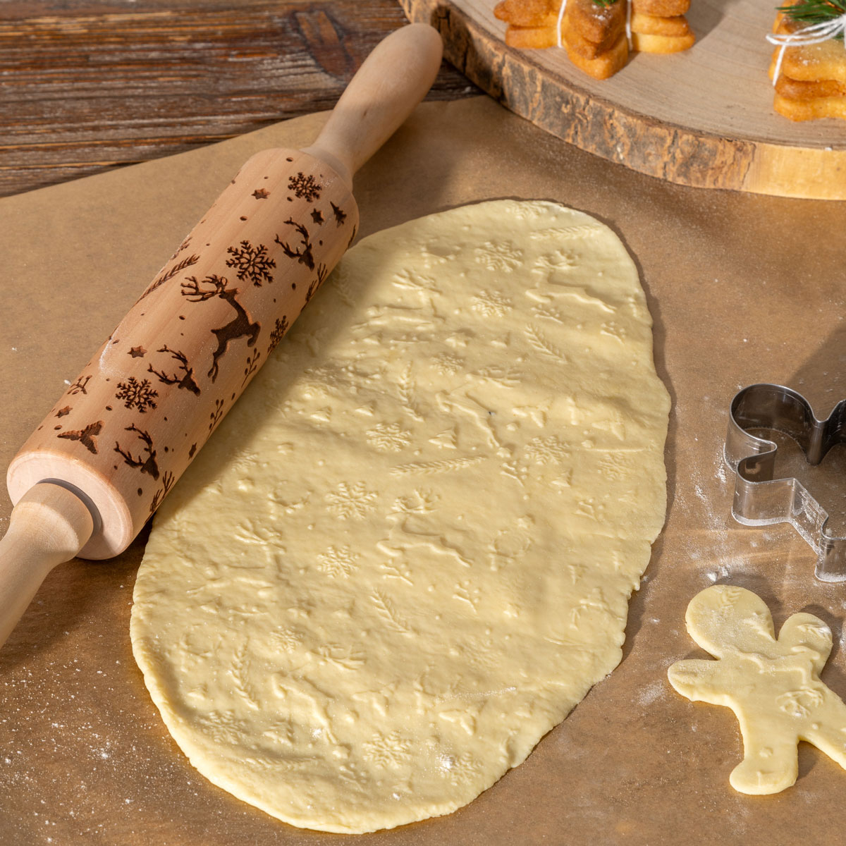 Πλάστης ζαχαροπλαστικής με σχέδιο ελάφι, κατασκευασμένος από ξύλο λωτού, κατάλληλο για επαφή με τρόφιμα, σε φυσική απόχρωση. Χάρη στη χάραξη του το μοτίβο τυπώνεται στη ζύμη και παραμένει μετά το ψήσιμο. Χρησιμοποιήστε τον για να φτιάξετε εντυπωσιακά σχέδια σε μπισκότα, ζύμες και όπου αλλού θέλετε. Συνιστάται να αλευρώσετε το ρολό πριν το χρησιμοποιήσετε στη ζύμη.