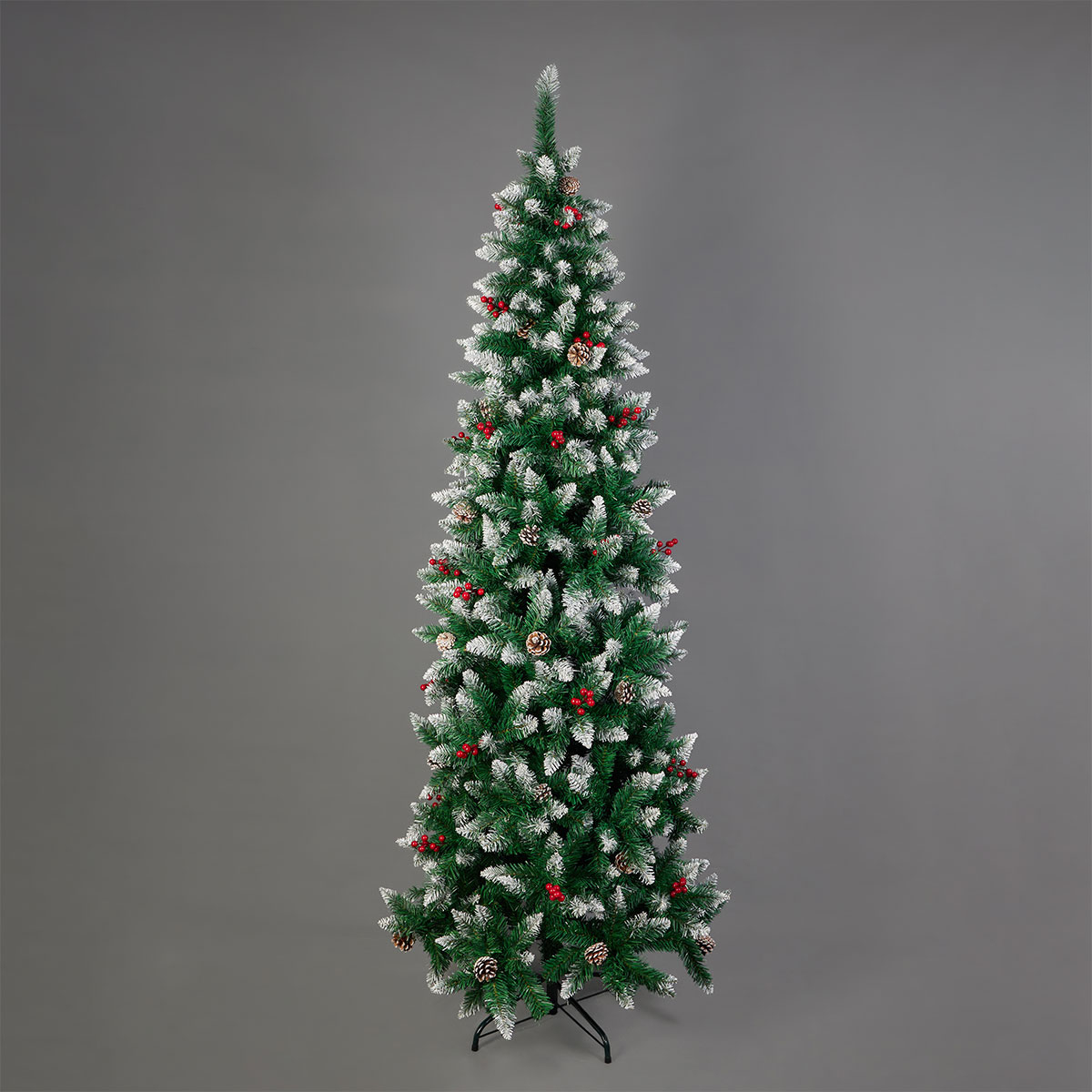 Χριστουγεννιάτικο δέντρο slim από την εταιρεία Eurolamp. Είναι πράσινο με χιονισμένο εφέ στις άκρες και διακοσμητικά κόκκινα μούρα και κουκουνάρια. Έχει 90εκ. διάμετρο, 240εκ. ύψος και 900 κλαδιά συνολικά. Το υλικό κατασκευής των κλαδιών είναι PVC και διαθέτει μεταλλική βάση στήριξης. Είναι στενό, ιδανικό για να στολίσει ακόμα και τους πιο μικρούς χώρους. Συνολικό βάρος δέντρου: 6.4 κιλά. Τοποθέτηση κλαδιών: Ανακλινόμενα.