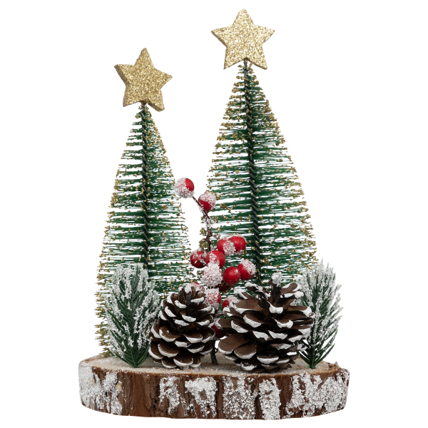 Χριστουγεννιάτικο διακοσμητικό με δεντράκια και κουκουνάρια πάνω σε κορμό κέδρου. Είναι κατασκευασμένα από πλαστικό υλικό σε πράσινο χρώμα με χρυσές λεπτομέρειες και εφέ χιονιού. Τοποθετήστε το σε οποιονδήποτε χώρο του σπιτιού σας για να δώσετε μια χριστουγεννιάτικη νότα.