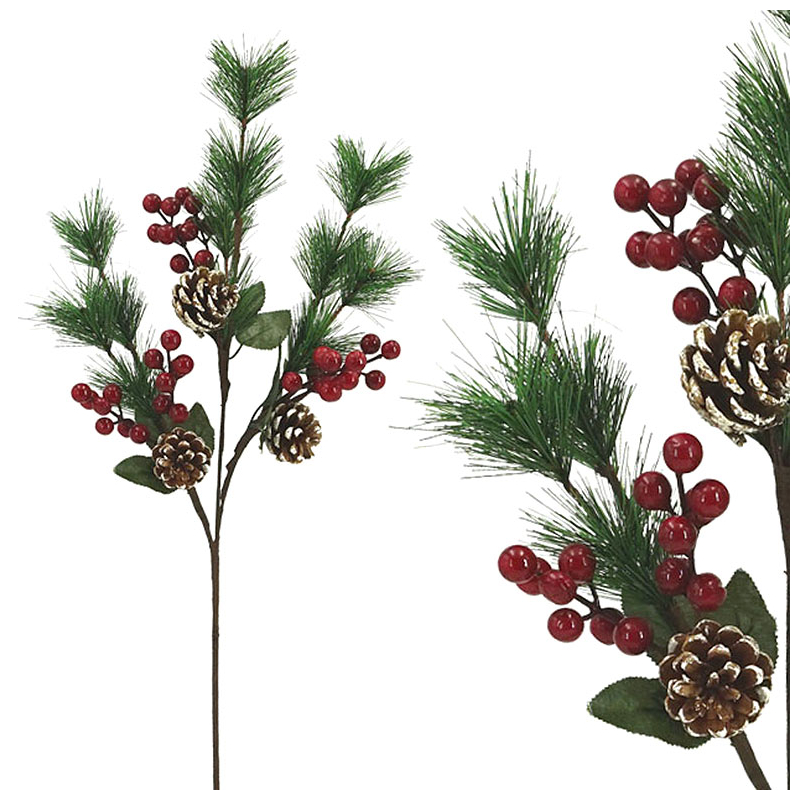 Τεχνητό κλαδί γκι από την εταιρεία Marhome. Έχει βελονοειδή φύλλα πεύκου σε πράσινο χρώμα, κόκκινους καρπούς και κουκουνάρια. Είναι κατασκευασμένο από πλαστικό υλικό και σίδερο στο εσωτερικό του για να μπορεί να σταθεί. Χρησιμοποιήστε τεχνητά φυτά για να δώσετε γιορτινή νότα πάνω στο χριστουγεννιάτικο δέντρο σαν στολίδια ή σε ένα βάζο.