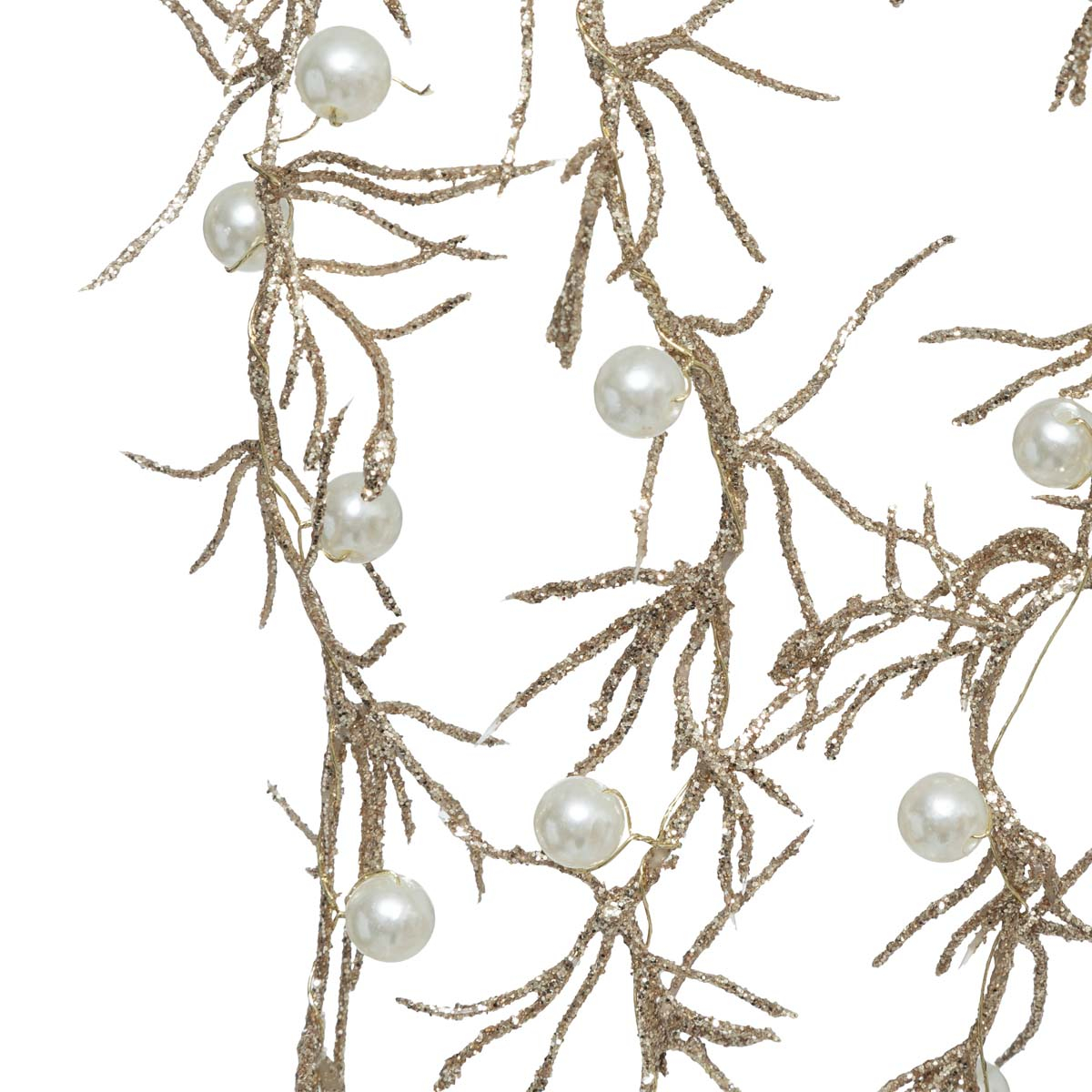 Χριστουγεννιάτικο διακοσμητικό κλαδί σε χρυσό χρώμα με γκλίτερ και λευκές πέρλες. Είναι κατασκευασμένο από πολυαιθυλένιο. Χρησιμοποιήστε τεχνητά φυτά για να τα διακοσμήσετε μέσα σε ένα βάζο και να δώσετε γιορτινή νότα ή στο χριστουγεννιάτικο δέντρο για να γεμίσετε τα κενά.