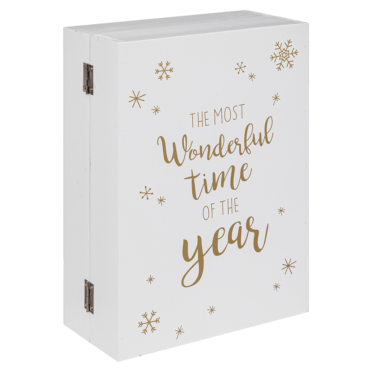 Χριστουγεννιάτικο διακοσμητικό ημερολόγιο κατασκευασμένο από κόντρα πλακέ σε λευκό χρώμα με χρυσές λεπτομέρειες. Έχει 24 αριθμούς που σας επιτρέπουν να μετράτε αντίστροφα τις μέρες για τα Χριστούγεννα. Τοποθετήστε το σε οποιοδήποτε σημείο του σπιτιού σας για να ολοκληρώσετε την εορταστική σας διακόσμηση και να κερδίσετε τις εντυπώσεις.