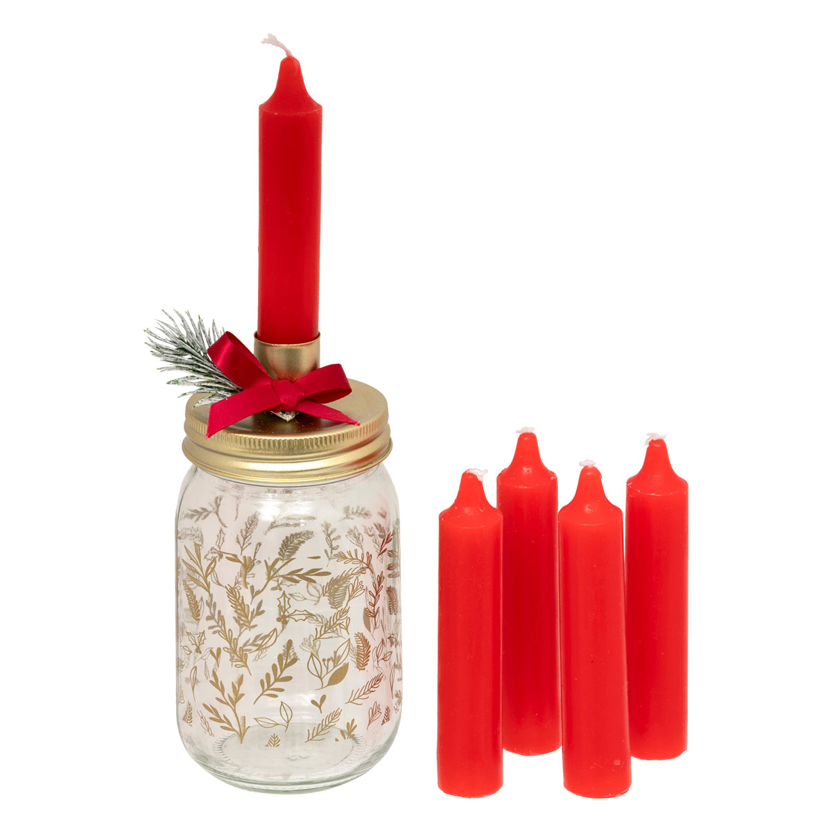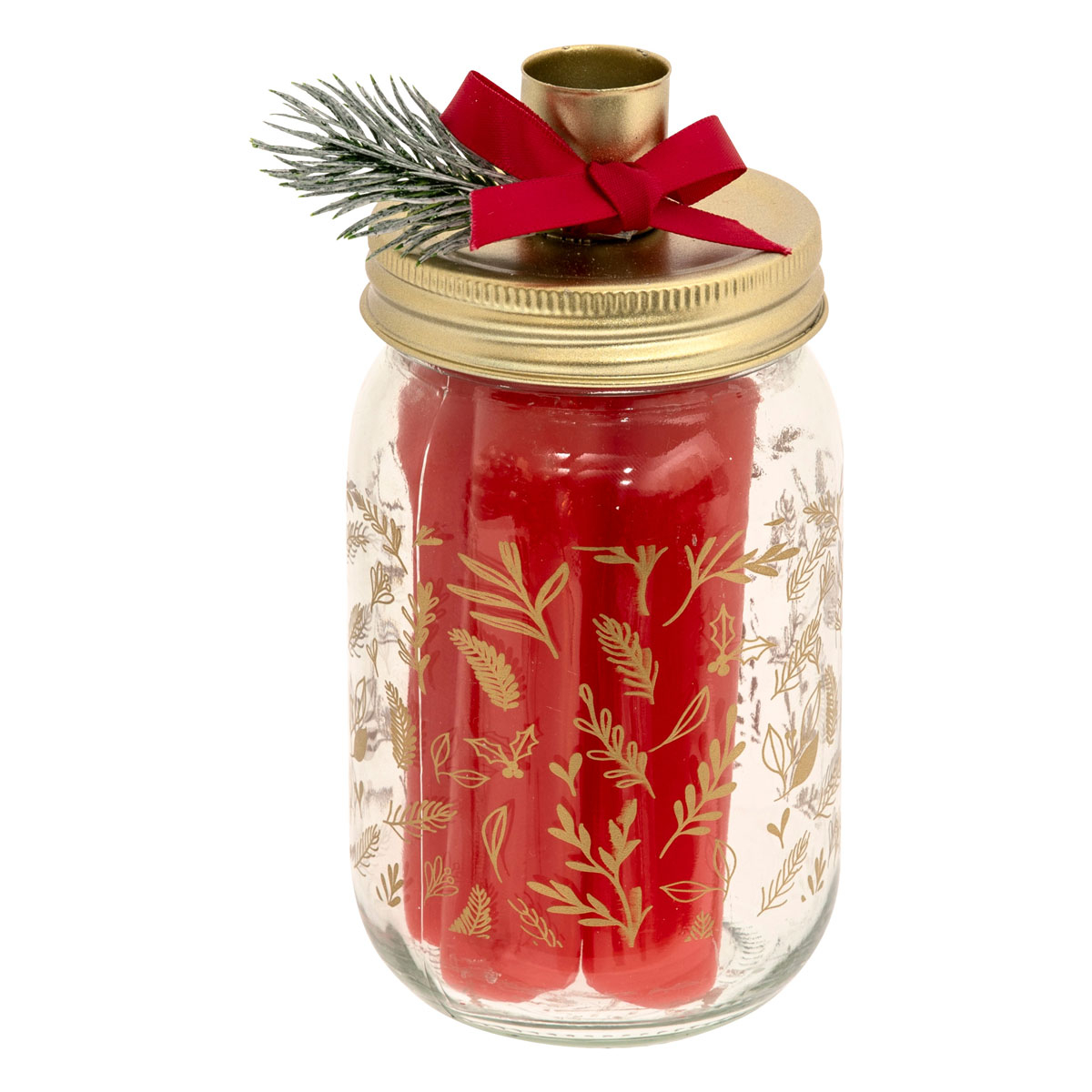 Χριστουγεννιάτικο κηροπήγιο κηροπήγιο σε γυάλινο βάζο με χρυσά σχέδια. Το καπάκι του διαθέτει υποδοχή για κερί και είναι διακοσμημένο με κόκκινη κορδέλα και κλαδάκι. Στο εσωτερικό του βάζου περιλαμβάνονται 5 λευκά κεριά έτοιμα για χρήση. Συνδυάστε το με άλλα γιορτινά διακοσμητικά για ένα αρμονικό αποτέλεσμα.
