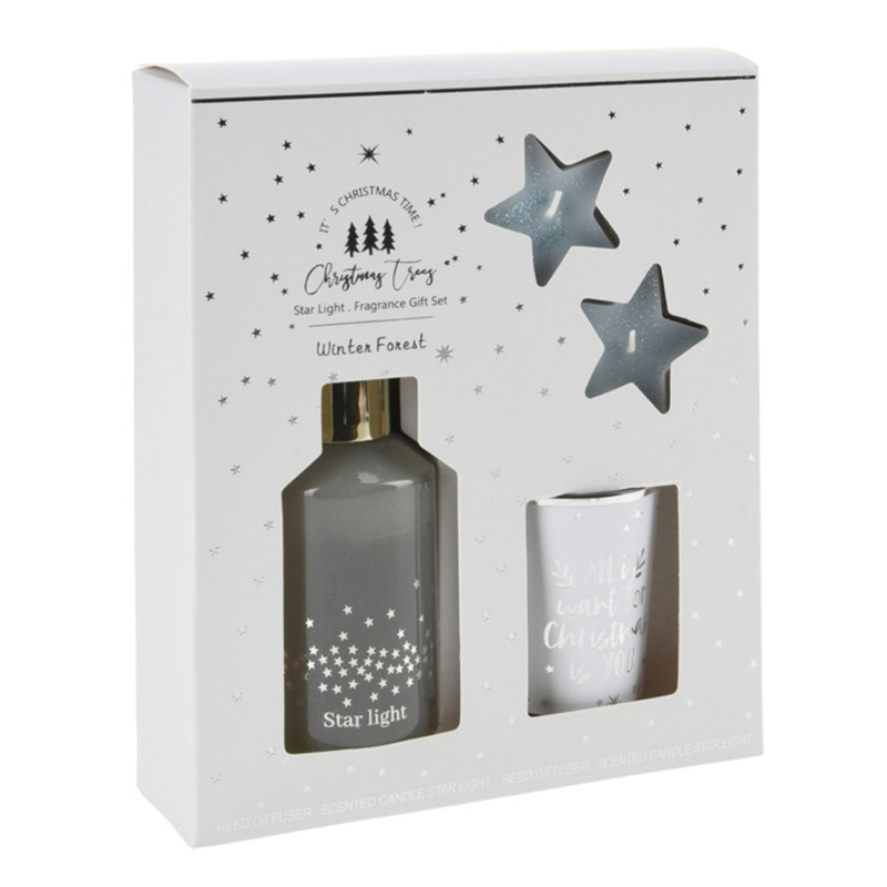 Χριστουγεννιάτικο σετ αρωματικών αποτελούμενο από αρωματικό χώρου με στικς που διαχέουν μοναδικά το άρωμα στο χώρο σας, αρωματικό κερί και κεράκια ρεσώ. Το άρωμά τους συνδυάζει νότες από γκρέιπφρουτ, γιασεμί, τριαντάφυλλο, τόνκα, δρυ και κεχριμπαρι.