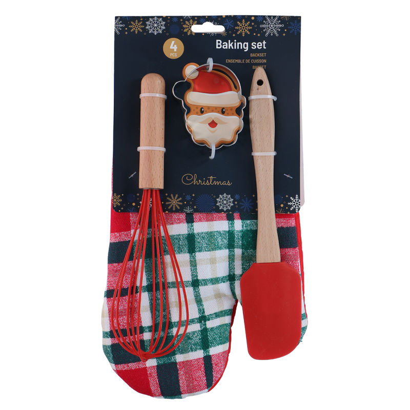 Χριστουγεννιάτικο σετ ζαχαροπλαστικής από την εταιρεία Alpina. Το σετ περιλαμβάνει: 1 γάντι κουζίνας, 1 κουπ πατ ζαχαροπλαστικής, 1 σπάτουλα και 1 αναδευτήρας αυγών 5 συρμάτων. Η σπάτουλα είναι κατασκευασμένη από σιλικόνη σε κόκκινο χρώμα με ξύλινη μπεζ λαβή. Ο αναδευτήρας έχει κόκκινο χρώμα με ξύλινη μπεζ λαβή. Το γάντι έχει καρό σχέδιο σε κόκκινο, λευκό και πράσινο χρώμα. Το κουπ πατ είναι κατασκευασμένο από ανοξείδωτο υλικό σε σχήμα Άγιου Βασίλη. Χρησιμοποιήστε Χριστουγεννιάτικα είδη για να προσφέρετε γιορτινή διάθεση στην ατμόσφαιρα.