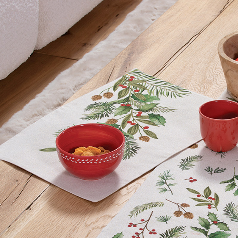 Χριστουγεννιάτικο σουπλά από την εταιρεία Nef-Nef σε λευκό χρώμα με πράσινο-καφέ και κόκκινο μοντέρνο σχέδιο. Η σύνθεσή του είναι από 89% βαμβάκι, 7% συνθετική ίνα και 4% polyester. Ιδανικό για να δώσει γιορτινό ύφος στο τραπέζι σας. Συνδυάστε το με τα υπόλοιπα προϊόντα της συλλογής για ένα ολοκληρωμένο αποτέλεσμα.