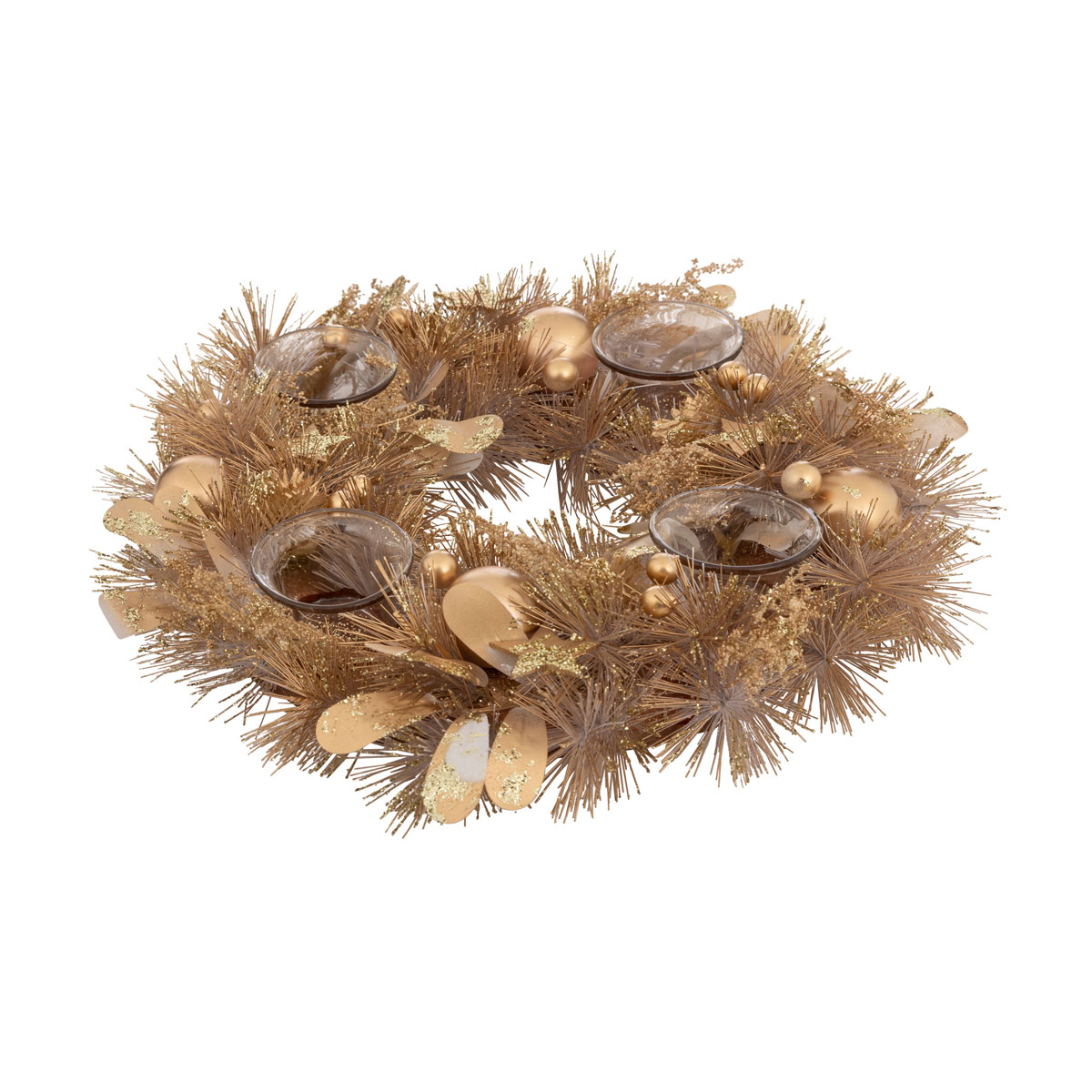 Χριστουγεννιάτικο κηροπήγιο με 4 θέσεις για κεριά με σχήμα στεφανιού σε μπεζ-χρυσό χρώμα. Είναι κατασκευασμένο από PVC και έχει γυάλινα ποτηράκια για να τοποθετήσετε τα κεριά. Ιδανικό για να στολίσετε το τραπέζι του σαλονιού ή της τραπεζαρίας και να ολοκληρώσετε την εορταστική σας διακόσμηση.