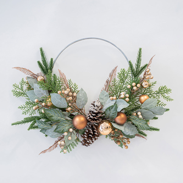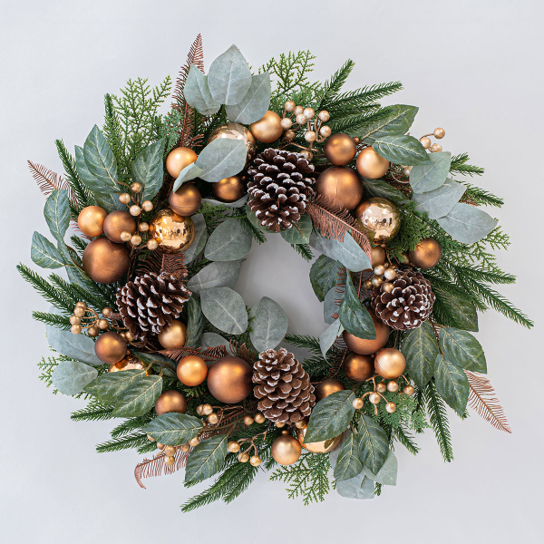 Χριστουγεννιάτικο στεφάνι από την εταιρεία Eurolamp. Είναι κατασκευασμένο από πλαστικό υλικό σε πράσινο χρώμα με κουκουνάρια και χάλκινες διακοσμητικές μπάλες. Η μισή μεριά είναι ασημί κρίκος ενώ η άλλη μισή έχει τεχνητά κλαδιά. Μπορείτε να το κρεμάσετε στην πόρτα σας ή σε κάποιον κενό τοίχο, για να δημιουργήσετε μία μοναδική εορταστική ατμόσφαιρα