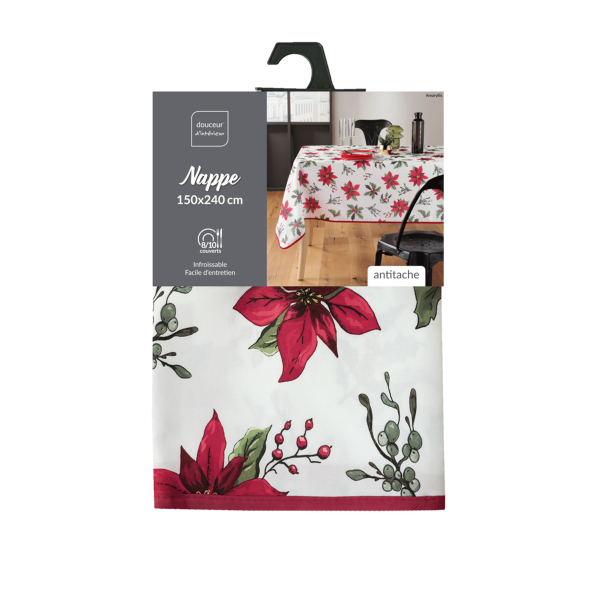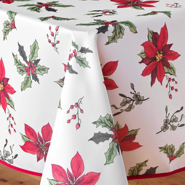 Χριστουγεννιάτικο αλέκιαστο τραπεζομάντηλο σε εκρού χρώμα με μπορντώ-πράσινες λεπτομέρειες. Το ύφασμα 100% polyester και η αλέκιαστη ιδιότητά του το καθιστούν πρακτικό και εύχρηστο, ειδικά την περίοδο των Χριστουγέννων.
