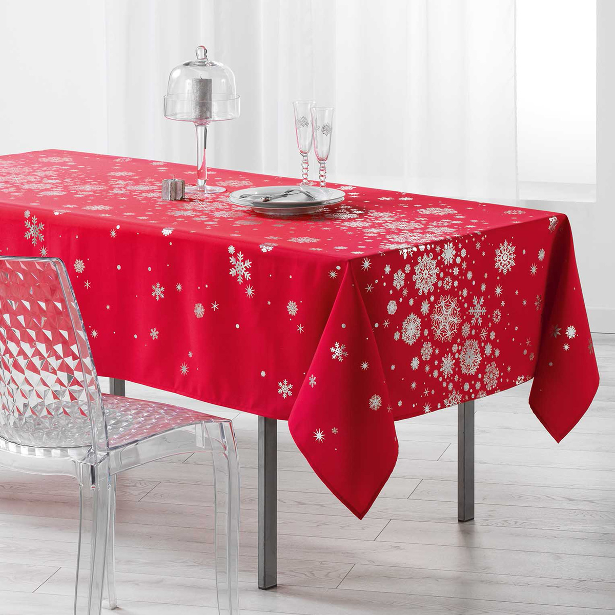 Χριστουγεννιάτικο αλέκιαστο τραπεζομάντηλο σε κόκκινο χρώμα με μεταλλιζέ νιφάδες. Το ύφασμα 100% polyester και η αλέκιαστη ιδιότητά του το καθιστούν πρακτικό και εύχρηστο, ειδικά την εορταστική περίοδο των Χριστουγέννων.