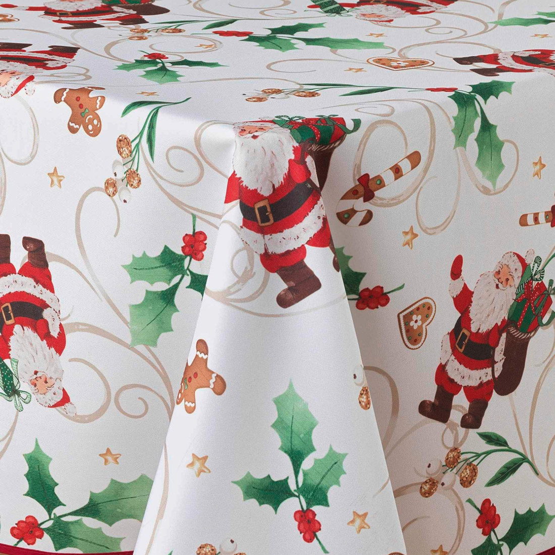 Χριστουγεννιάτικο αλέκιαστο τραπεζομάντηλο σε λευκό χρώμα με κόκκινες-πράσινες-μπεζ λεπτομέρειες και σχέδιο με τον Άγιο Βασίλη. Το ύφασμα 100% polyester και η αλέκιαστη ιδιότητά του το καθιστούν πρακτικό και εύχρηστο, ειδικά την περίοδο των Χριστουγέννων.