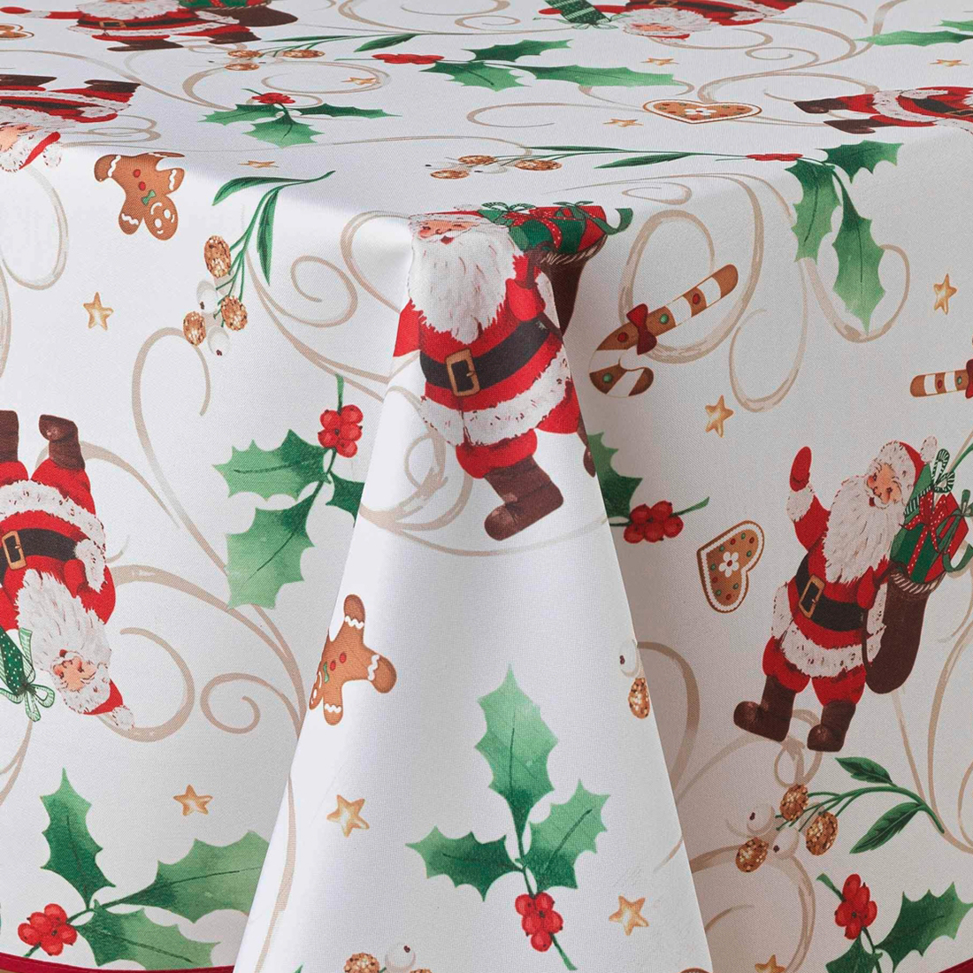Χριστουγεννιάτικο αλέκιαστο τραπεζομάντηλο σε λευκό χρώμα με κόκκινες-πράσινες-μπεζ λεπτομέρειες και σχέδιο με τον Άγιο Βασίλη. Το ύφασμα 100% polyester και η αλέκιαστη ιδιότητά του το καθιστούν πρακτικό και εύχρηστο, ειδικά την περίοδο των γιορτών.