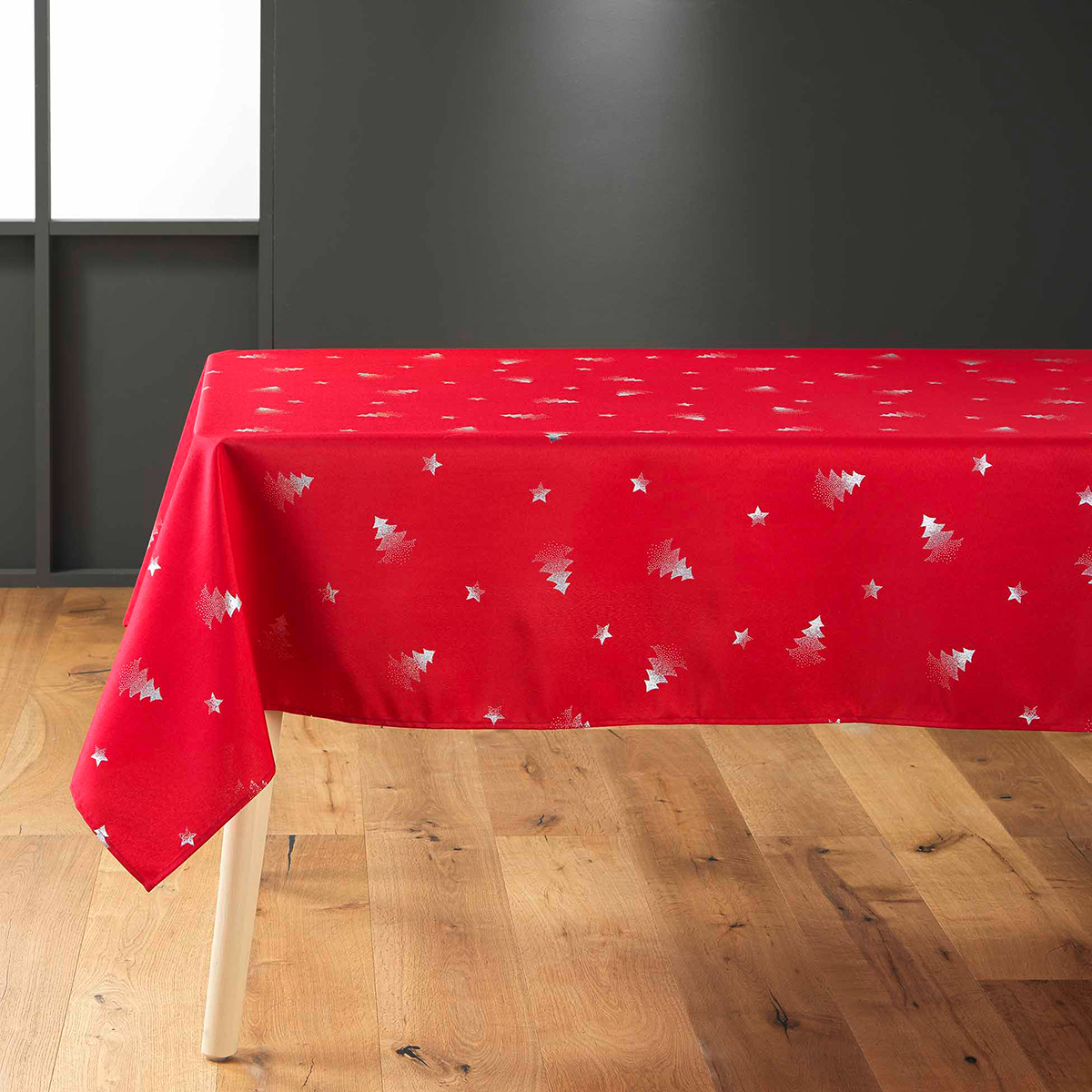 Χριστουγεννιάτικο αλέκιαστο τραπεζομάντηλο σε κόκκινο χρώμα με ασημί και σχέδιο με έλατα. Το ύφασμα 100% polyester και η αλέκιαστη ιδιότητά του το καθιστούν πρακτικό και εύχρηστο, ειδικά την περίοδο των γιορτών.