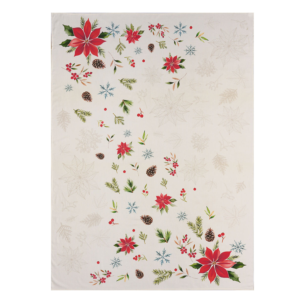 Χριστουγεννιάτικο τραπεζομάντηλο από την εταιρεία Kentia σε εκρού χρώμα με κόκκινες-πράσινες-μπεζ λεπτομέρειες. Το ύφασμα είναι καμβάς με σύνθεση 60% βαμβάκι και 40% polyester βάρους 180γραμ./τ.μ.. Ιδανικό για να εμπλουτίσει την εορταστική ατμόσφαιρα στην τραπεζαρία σας.