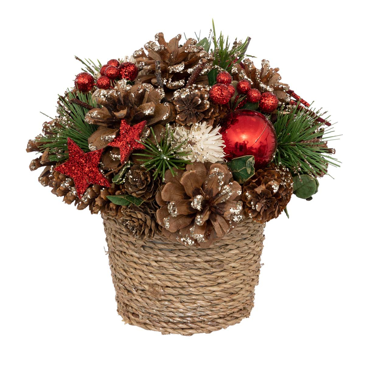 Χριστουγεννιάτικο φυτό σε γλάστρα, με κλαδιά έλατου και κουκουνάρια. Το γλαστράκι είναι κατασκευασμένο από πλαστικό ψάθινο υλικό. Χρησιμοποιήστε τεχνητά φυτά για να τα διακοσμήσετε μέσα σε ένα βάζο και να δώσετε γιορτινή νότα στο χώρο σας.