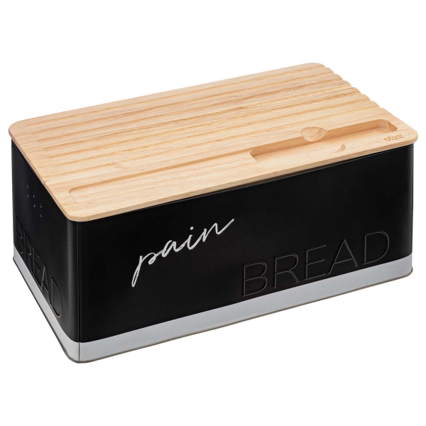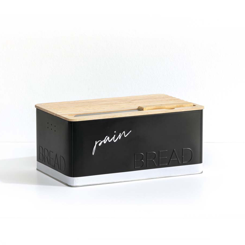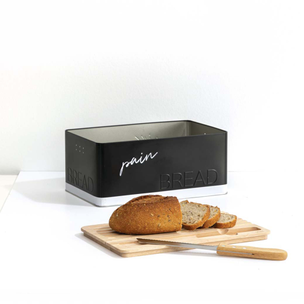 Ψωμιέρα κατασκευασμένη από μεταλλικό υλικό σε μαύρο χρώμα. Το καπάκι είναι ξύλινο και διαθέτει εγκοπές ώστε να χρησιμοποιείται και σαν επιφάνεια κοπής για το ψωμί. Στο σετ περιλαμβάνεται και μαχαίρι ψωμιού με ξύλινη λαβή.