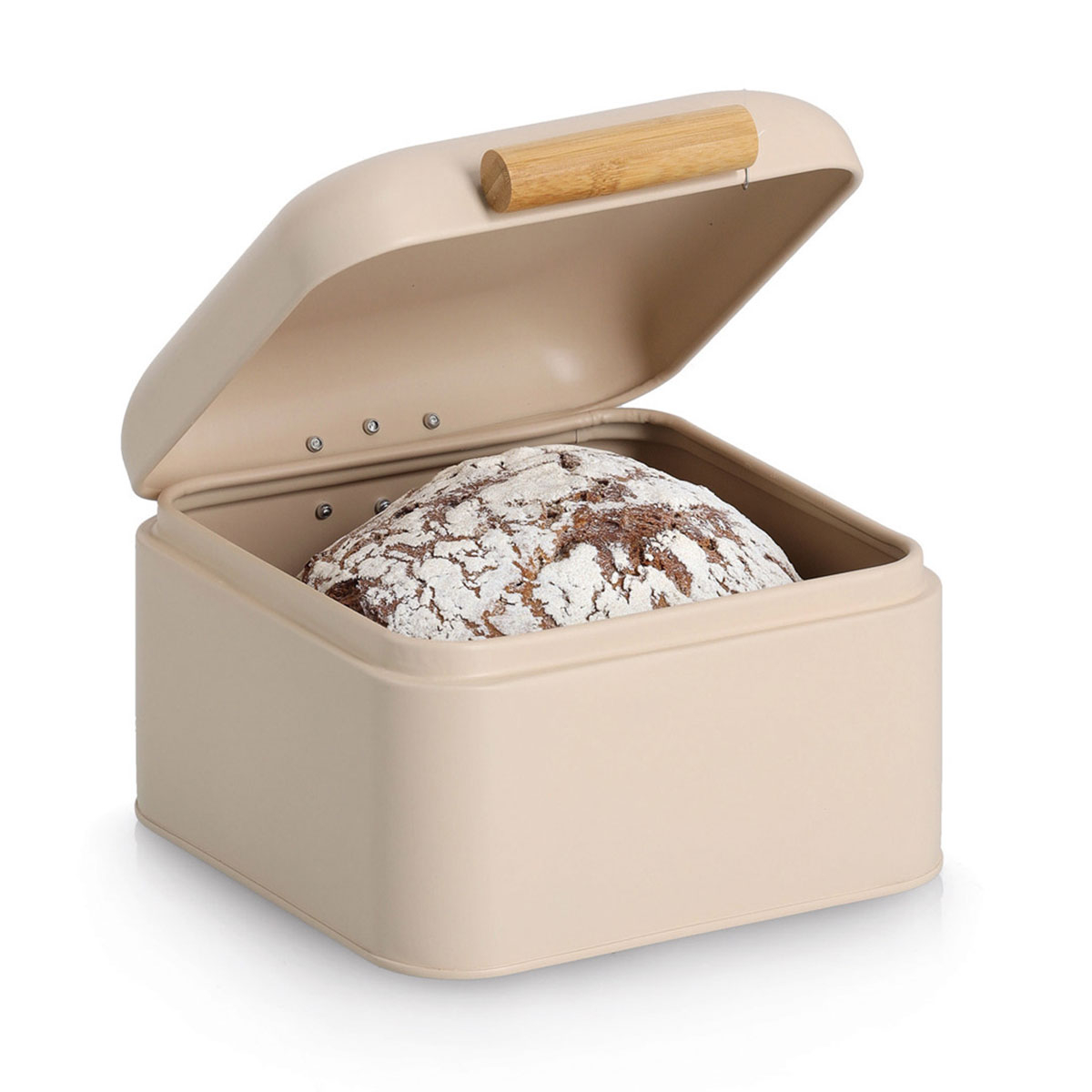 Ψωμιέρα με καπάκι και μοντέρνο σχεδιασμό. Είναι κατασκευασμένη από μεταλλικό υλικό σε εκρού χρώμα με λαβή από bamboo. Ο πρακτικός σχεδιασμός της προστατεύει το ψωμί από την υγρασία και βοηθά στη διατήρηση της τάξης στον πάγκο της κουζίνας. Ιδανική για τη σωστή αποθήκευση ψωμιού και αρτοσκευασμάτων, διατηρώντας τα φρέσκα για περισσότερο χρόνο.