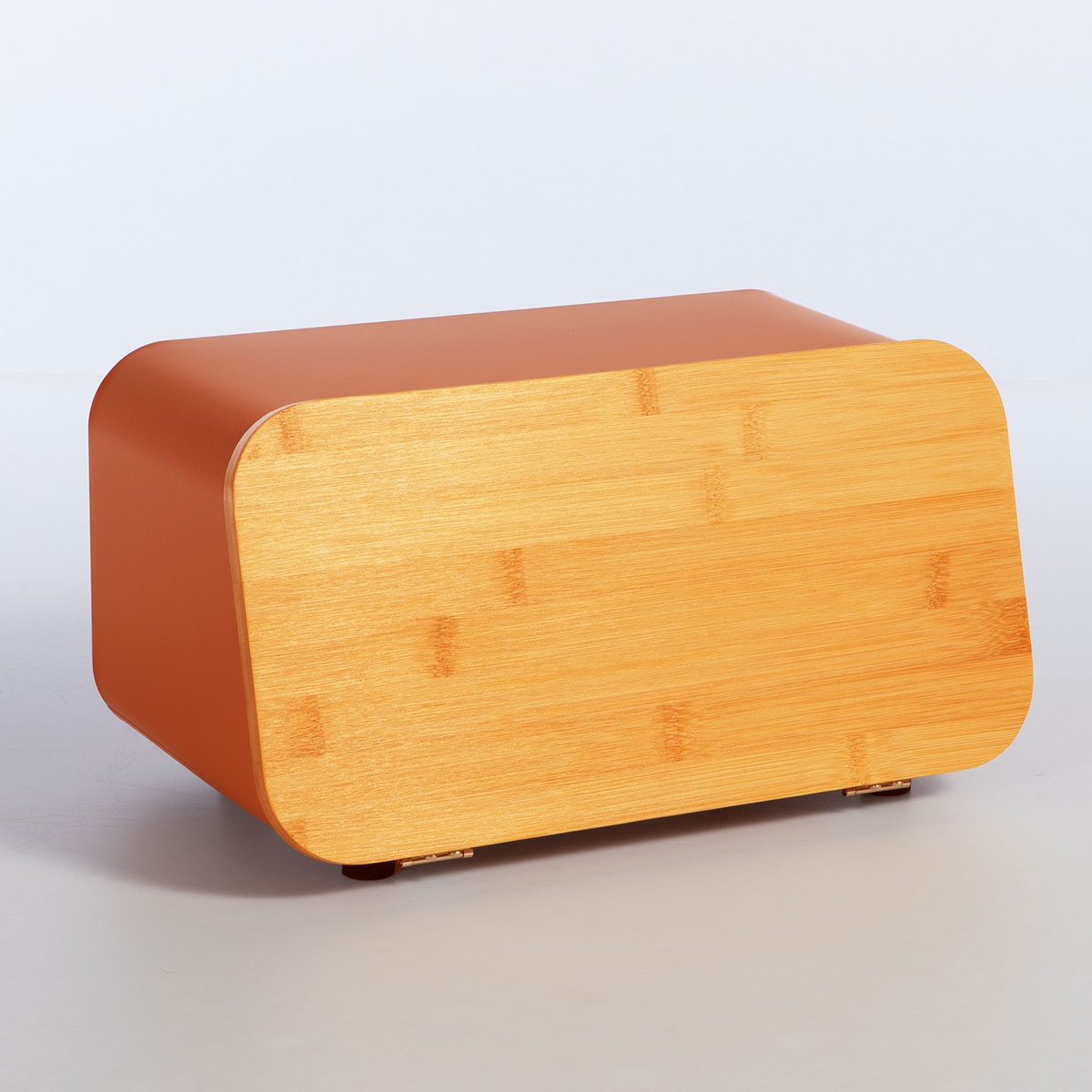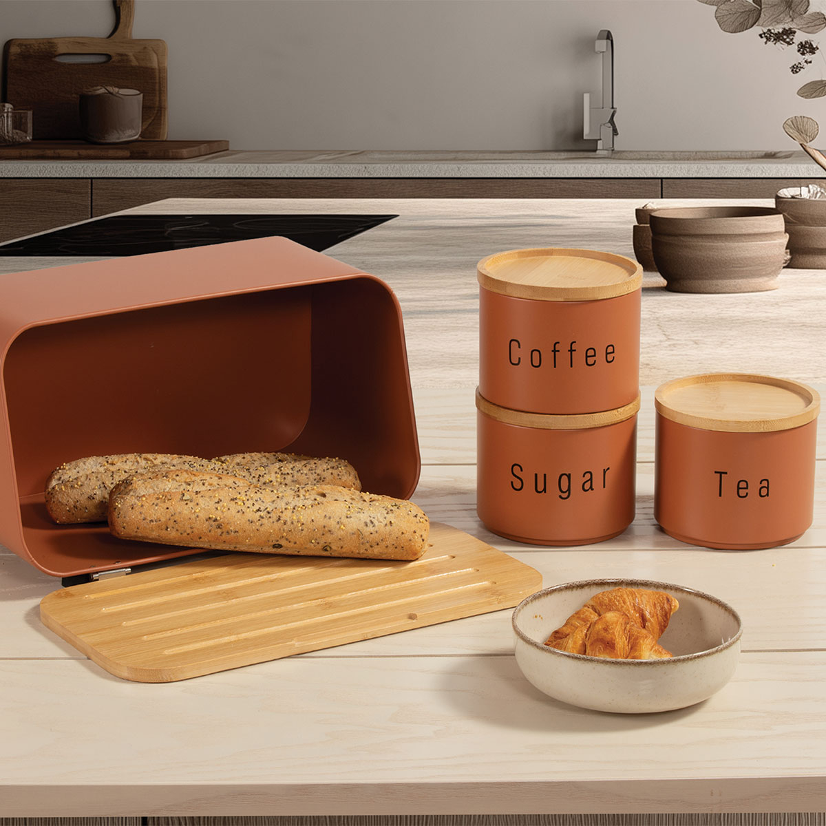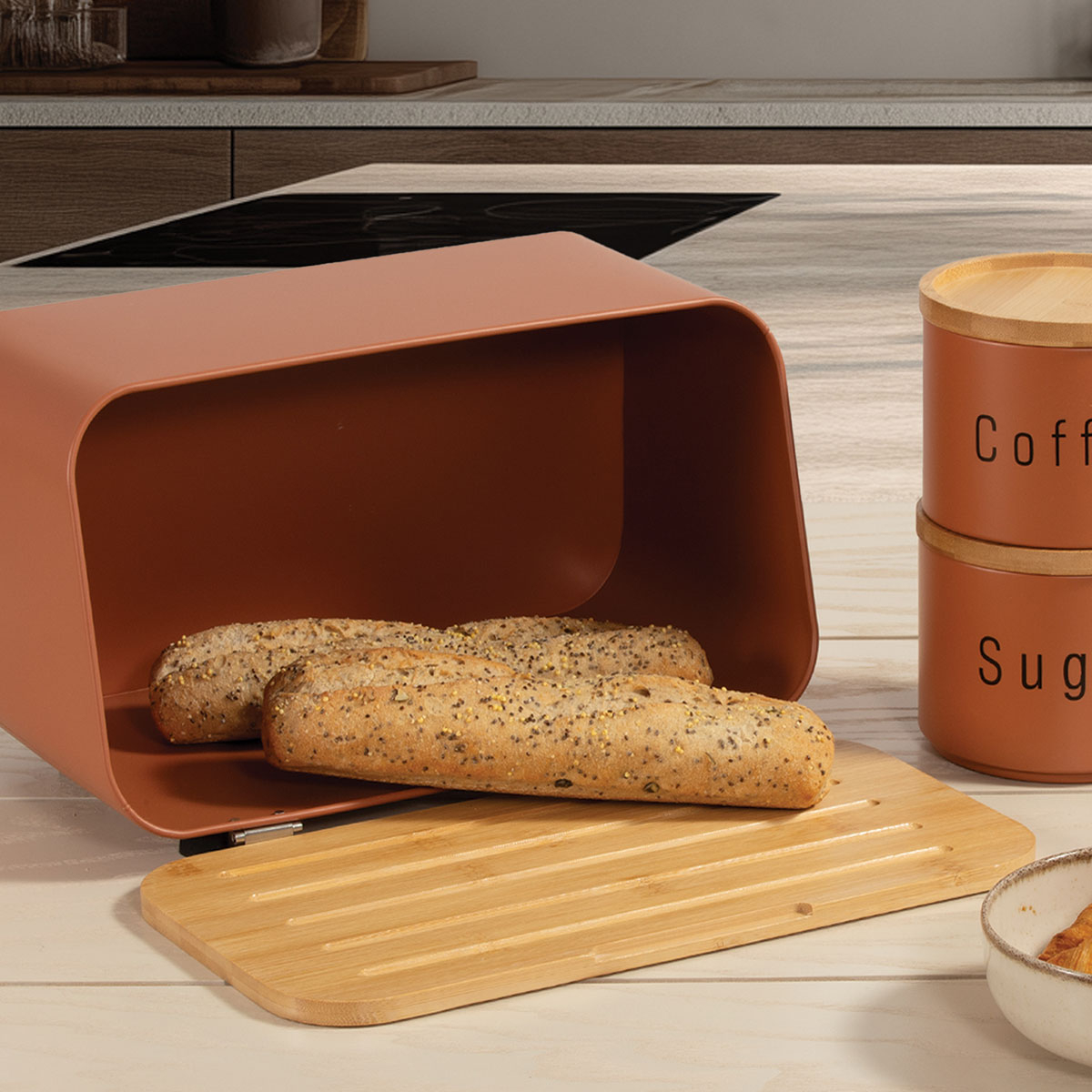 Ψωμιέρα της εταιρείας Nef-Nef σε χρώμα τερακότας. Είναι κατασκευασμένη από μεταλλικό υλικό και έχει ξύλινο καπάκι που μπορεί να χρησιμοποιηθεί και σαν επιφάνεια κοπής του ψωμιού. Ιδανική για να οργανώσετε τον χώρο της κουζίνας και να τον διατηρείτε καθαρό, χωρίς ψίχουλα.