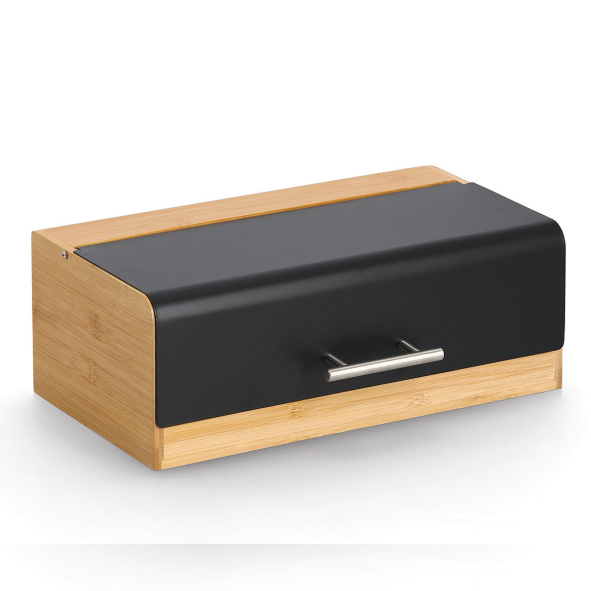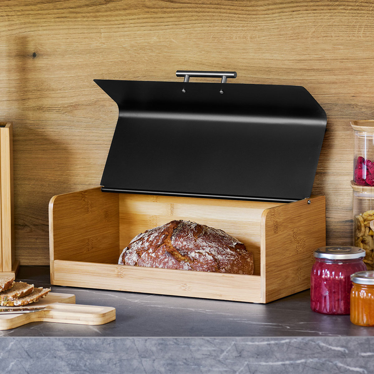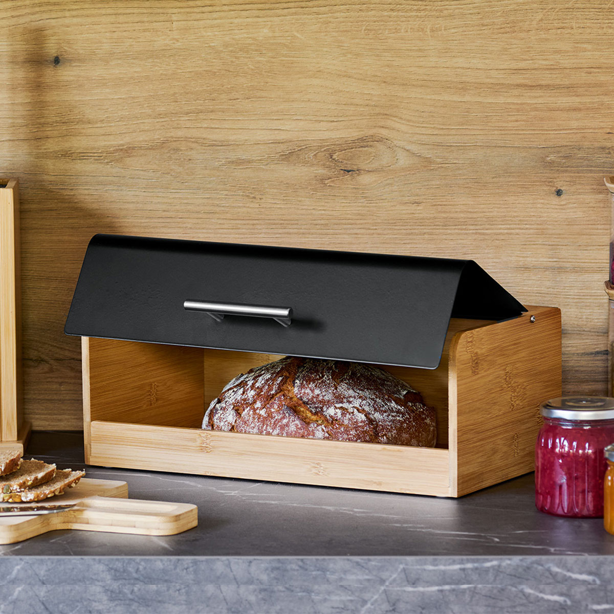 Ψωμιέρα με μοντέρνο σχεδιασμό κατασκευασμένη από ξύλο bamboo σε φυσική απόχρωση με μαύρη λεπτομέρεια από μεταλλικό υλικό. Διαθέτει ανακλινόμενο μεταλλικό καπάκι με πρακτική λαβή, που ανοίγει εύκολα και προσφέρει άνετη πρόσβαση στο περιεχόμενο. Ο συνδυασμός φυσικού μπαμπού και μετάλλου δημιουργεί ένα μοντέρνο και ιδιαίτερα καλαίσθητο αποτέλεσμα που ταιριάζει σε κάθε κουζίνα. Μια πρακτική και κομψή λύση για την αποθήκευση ψωμιού στον πάγκο της κουζίνας. Ιδανική για τη σωστή αποθήκευση ψωμιού και αρτοσκευασμάτων, διατηρώντας τα φρέσκα για περισσότερο χρόνο. Ξύλο με πιστοποίηση FSC.