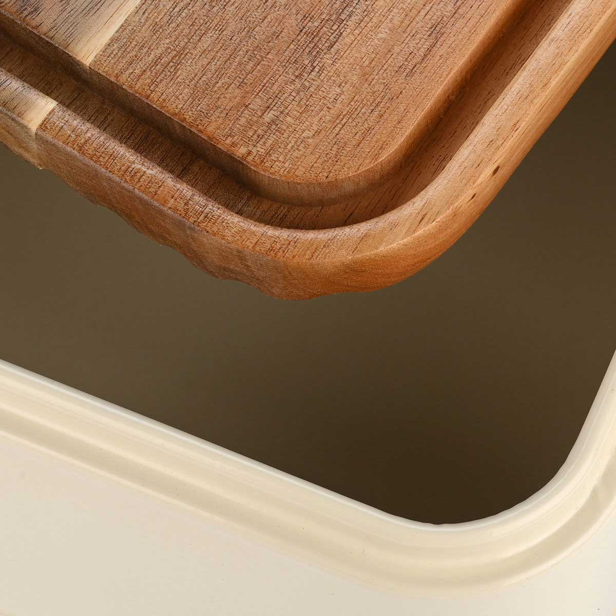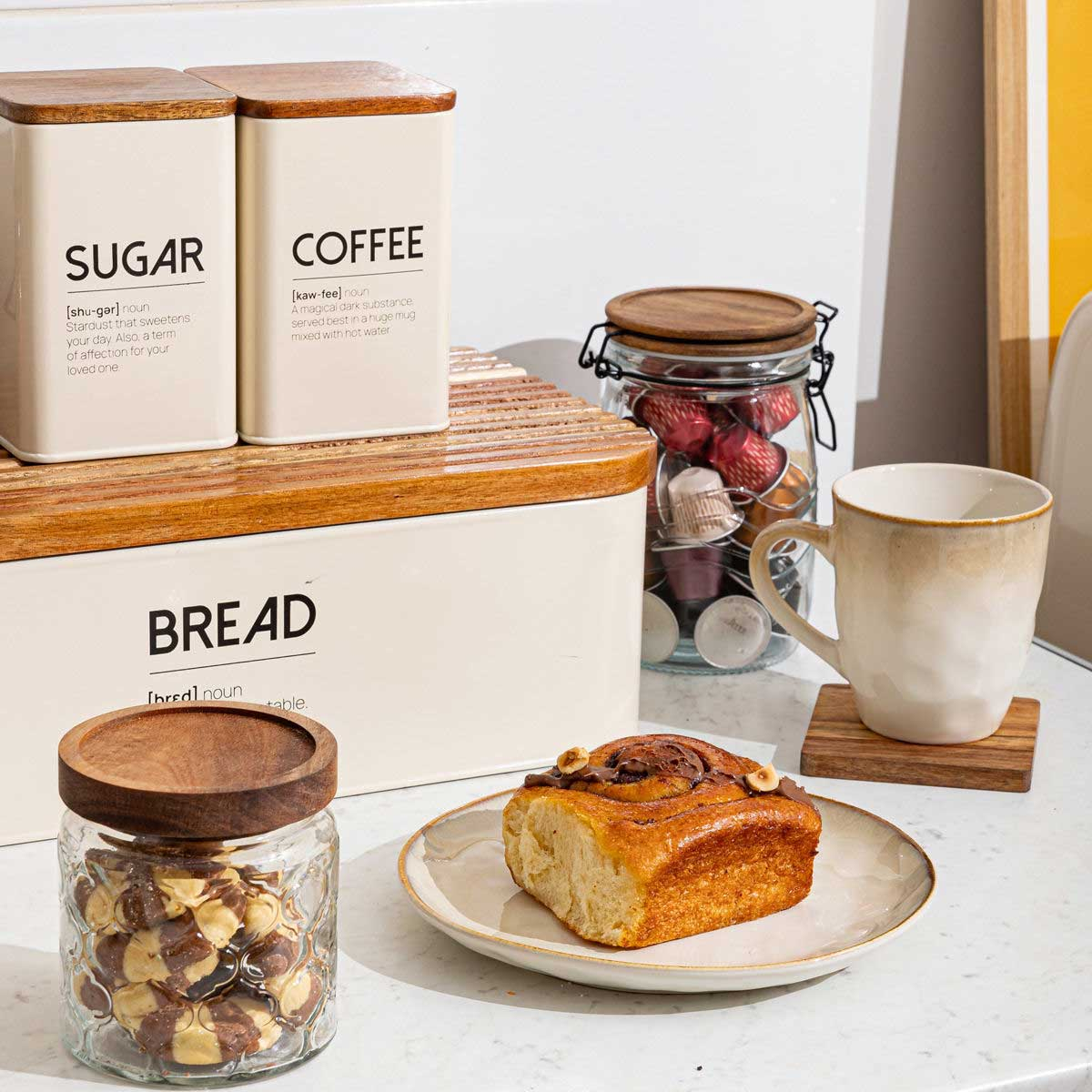 Ψωμιέρα της εταιρείας εstia. Είναι κατασκευασμένη από μεταλλικό υλικό σε μπεζ χρώμα. Έχει καπάκι από ξύλο ακακίας σε φυσική απόχρωση. Το καπάκι μπορεί να χρησιμοποιηθεί και σαν ξύλο κοπής του ψωμιού. Συνδυάστε τη με τα υπόλοιπα είδη της σειράς για ένα ολοκληρωμένο αποτέλεσμα.