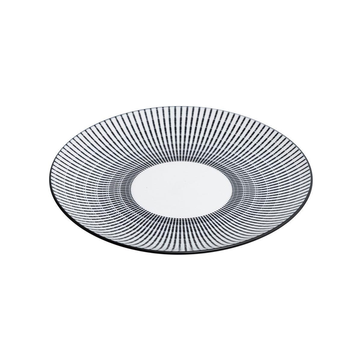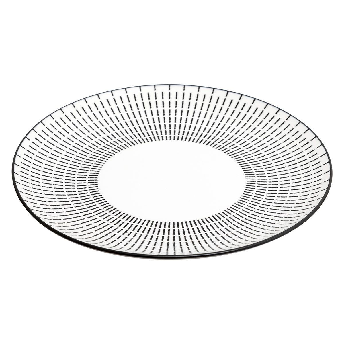 Σερβίτσιο φαγητού αποτελούμενο από ρηχά πιάτα, βαθιά πιάτα και πιάτα φρούτου/πάστας σε λευκό χρώμα και μοντέρνο σχέδιο σε μαύρο χρώμα. Σετ πιάτα κατασκευασμένα από πορσελάνη.