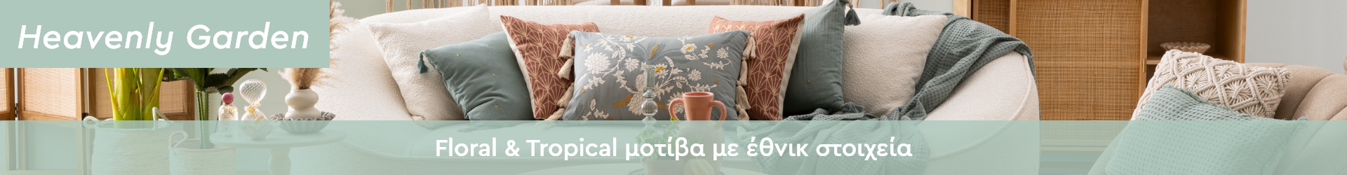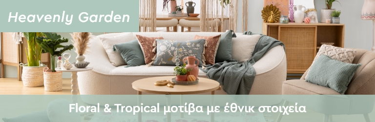 Μεταμορφώστε τον χώρο σας σε έναν γαλήνιο, λουλουδιασμένο κήπο γεμάτο φως και απαλές υφές. Ιδανικό για το σαλόνι, την κρεβατοκάμαρα ή ακόμα και για το γραφείο σας ώστε να δημιουργήσετε μια ρομαντική γωνιά διαβάσματος, το Heavenly Garden trend προσφέρει φινέτσα και τρυφερότητα. Επιλέξτε φλοράλ χαλιά, διακοσμητικά μαξιλάρια, καθώς και γυάλινα κηροπήγια με χρώματα όπως powder pink, βεραμάν και εκρού. Τα κεραμικά, η ψάθα και το βαμβάκι συνθέτουν έναν αρμονικό αποτέλεσμα απλότητας. Ανακαλύψτε τη νέα συλλογή του Heavenly Garden στο Spitishop και γεμίστε το σπίτι σας με μια αύρα ρομαντικής αναγέννησης!