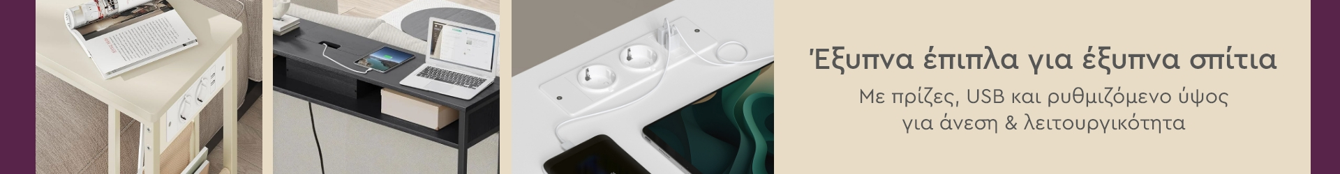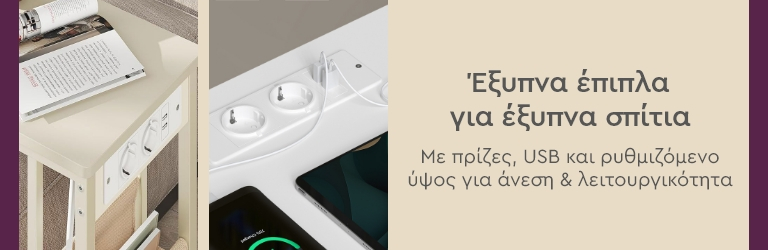 Τα «έξυπνα» έπιπλα που θα βρείτε στο Spitishop αποτελούν την ιδανική λύση για ένα σύγχρονο τρόπο ζωής, καθώς προσαρμόζονται απόλυτα στις ανάγκες της καθημερινότητάς σας. Διαθέτουν ενσωματωμένες πρίζες και θύρες USB, για να σας προσφέρουν ευκολία στη φόρτιση κάθε ηλεκτρικής συσκευής, χωρίς να χρειάζεται να ψάχνετε για επιπλέον καλώδια ή πολύπριζα. Πρόκειται για έπιπλα για βοηθητικά τραπεζάκια, κομοδίνα, ραφιέρες, κονσόλες εισόδου καθώς και ηλεκτρικά γραφεία, ιδανικά για κάθε δωμάτιο του σπιτιού, από το σαλόνι και το υπνοδωμάτιο μέχρι και για το γραφείο ή το παιδικό δωμάτιο ώστε να οργανώσετε το χώρο σας έξυπνα. Συνδυάστε τα έπιπλα αυτά με έπιπλα γραφείου, έπιπλα σαλονιού και έπιπλα κρεβατοκάμαρας και δημιουργήστε ένα ολοκληρωμένο σύνολο που θα αναβαθμίσουν την αισθητική του χώρου σας!