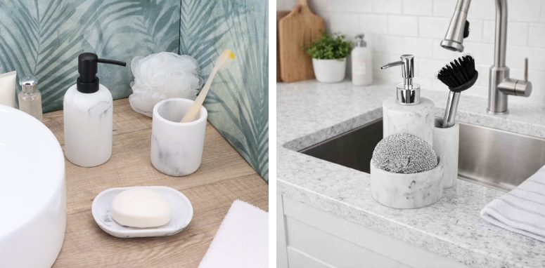 Με το marble effect όμως, η αισθητική υπεροχή συναντά και την χρηστικότητα! Το πλατώ σερβιρίσματος της Espiel και η αντίστοιχη τουρτιέρα μετατρέπουν κάθε γεύμα σε ιεροτελεστία, ενώ η κομψότητα φτάνει μέχρι την κουζίνα και το μπάνιο. Από το δοχείο υγρού πιάτων Estia Marble με θήκη για σφουγγάρι, μέχρι το καπάκι λεκάνης και το ποτήρι οδοντόβουρτσας της ίδιας σειράς, γίνεται σαφές ότι η ποιότητα και η προσοχή στη λεπτομέρεια παραμένουν σταθερές σε κάθε αντικείμενο της συλλογής.