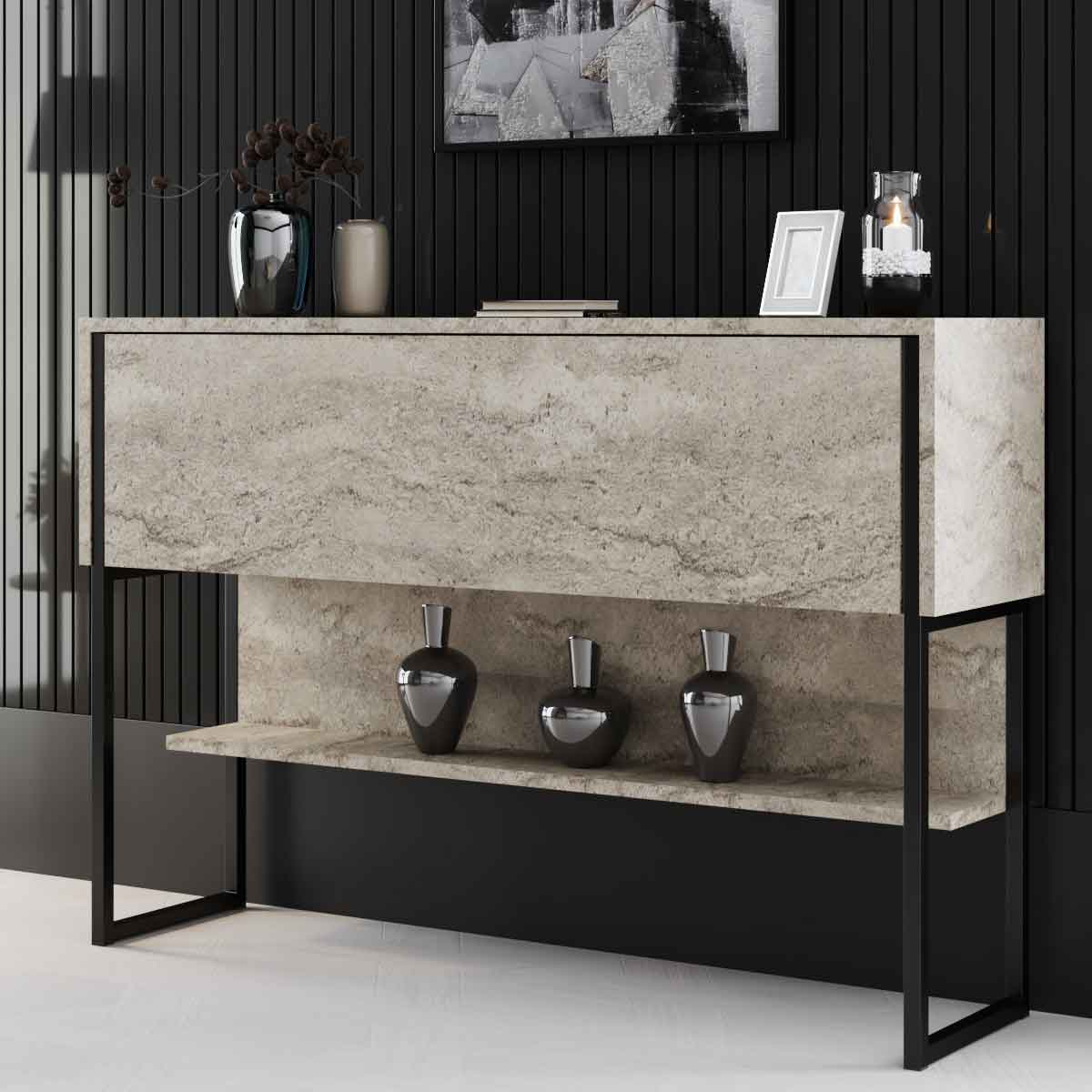 Για την είσοδο, η κονσόλα Luxe σε συνδυασμό travertine και μαύρου μετάλλου, ή το τραπέζι Consept με τα δύο επίπεδα ραφιών, προσφέρουν λύσεις που είναι ταυτόχρονα χρηστικές και πανέμορφες.