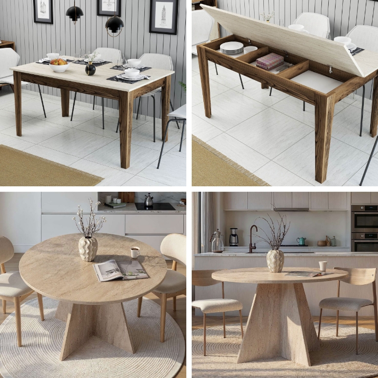 Η αισθητική αυτή περνάει και στον χώρο του φαγητού. Μια εντυπωσιακή στρογγυλή τραπεζαρία Virella γίνεται το σημείο αναφοράς, ενώ το τραπέζι κουζίνας Kiev (σε καθαρό travertine ή στον ζεστό συνδυασμό walnut-travertine) αποδεικνύει ότι η πολυτέλεια μπορεί να έχει και πρακτικό, αποθηκευτικό ρόλο.