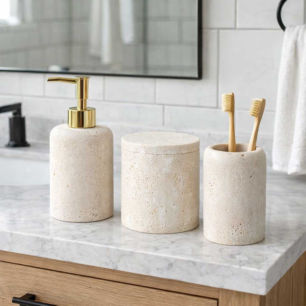 Η εμπειρία ολοκληρώνεται στο μπάνιο με τη σειρά Estia Travertine, όπου το dispenser, η ποτηροθήκη και η βαμβακοθήκη προσδίδουν μια αίσθηση spa στην καθημερινότητά σου.