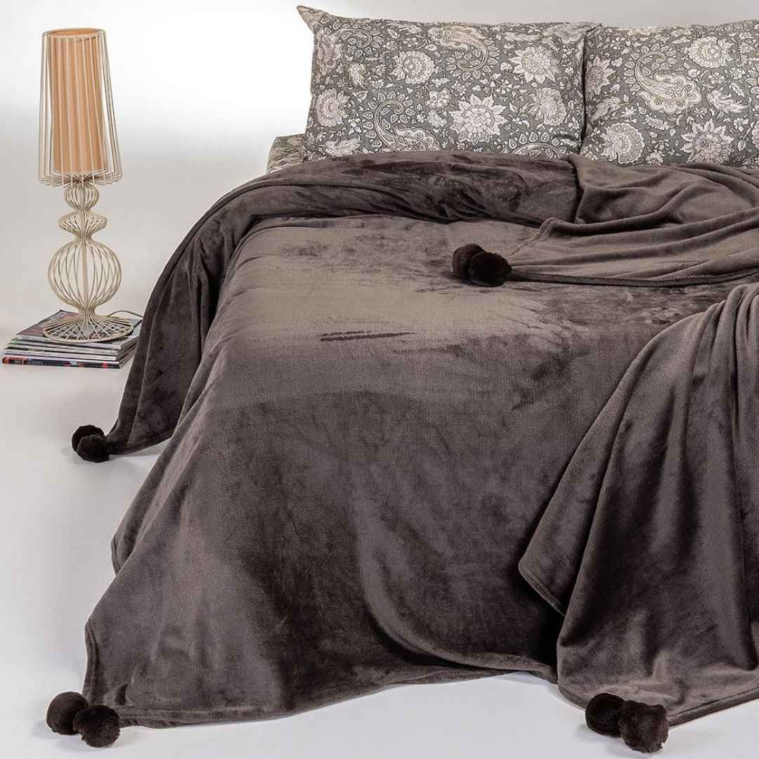 Επειδή όμως καμιά φορά ένα πάπλωμα δεν φτάνει για να μας ζεστάνει αυτές τις μέρες που κάνει λίγο κρύο παραπάνω, θα προχωρήσουμε με μία κουβέρτα Fleece της Melinen, τη Lisboa Brown Grey στα 21,70€! Είναι βελούδινη, αφράτη και ιδιαίτερα καλόγουστη, (πρόσεξες τα αξιαγάπητα pon-pon στις γωνίες;!) Το βάρος της είναι 220gsm, κάτι που την καθιστά πολύ απαλή και ζεστή. Μπορείς προς το παρόν να την σκεπάζεσαι πάνω από το πάπλωμά σου, και όταν φτιάξει με το καλό ο καιρός μπορείς να τη χρησιμοποιήσεις και μόνη της!