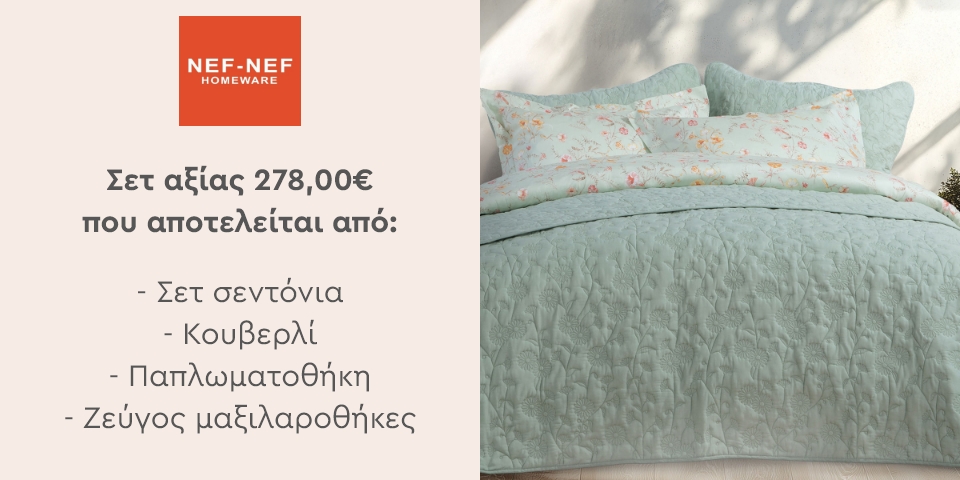 Τα χρώματα της φύσης επέλεξε η Nef-Nef στο ολοκληρωμένο σετ δώρου για το υπνοδωμάτιο με το συνδυασμό του φλοράλ σχεδίου στα υπέρδιπλα σεντόνια και την παπλωματοθήκη Nef-Nef Premium Mimosa με βεραμάν και μουσταρδί λεπτομέρειες, να δένουν εκπληκτικά με το χακί κουβερλί Premium Zinovia Mint. Το σετ ολοκληρώνει ένα ζεύγος βεραμάν, καπιτονέ μαξιλαροθήκες του ίδιου σχεδίου!