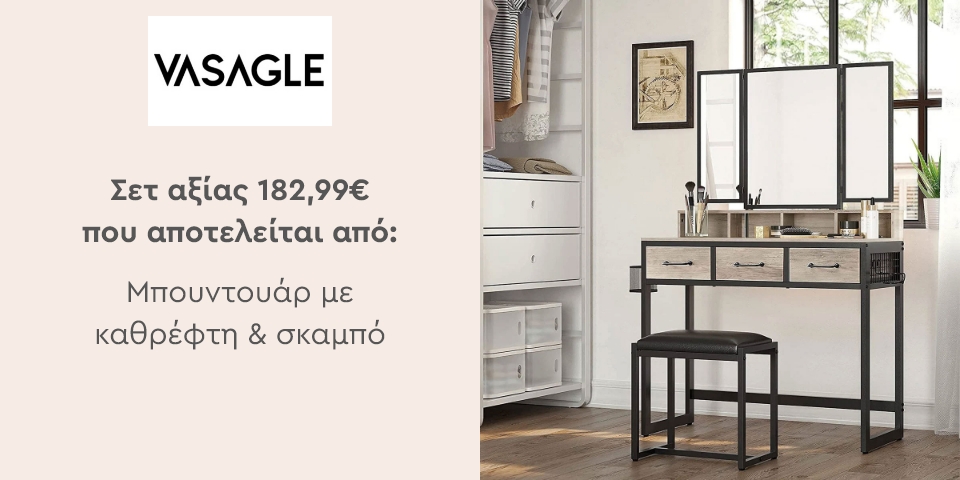Το απόλυτο must-have για κάθε γυναίκα που περιποιείται τον εαυτό της! Αυτό το καταπληκτικό μπουντουάρ της Vasagle διαθέτει τρίπτυχο καθρέφτη, συρτάρια για την τοποθέτηση των καλλυντικών σου, σκαμπό, βάση για πιστολάκι, κρεμαστή θήκη οργάνωσης και κρεμαστράκια για τα κοσμήματα σου! Ιδανικό έπιπλο για να έχεις οργανωμένα τα προϊόντα ομορφιάς ή τα κοσμήματα που χρησιμοποιείς καθημερινά.