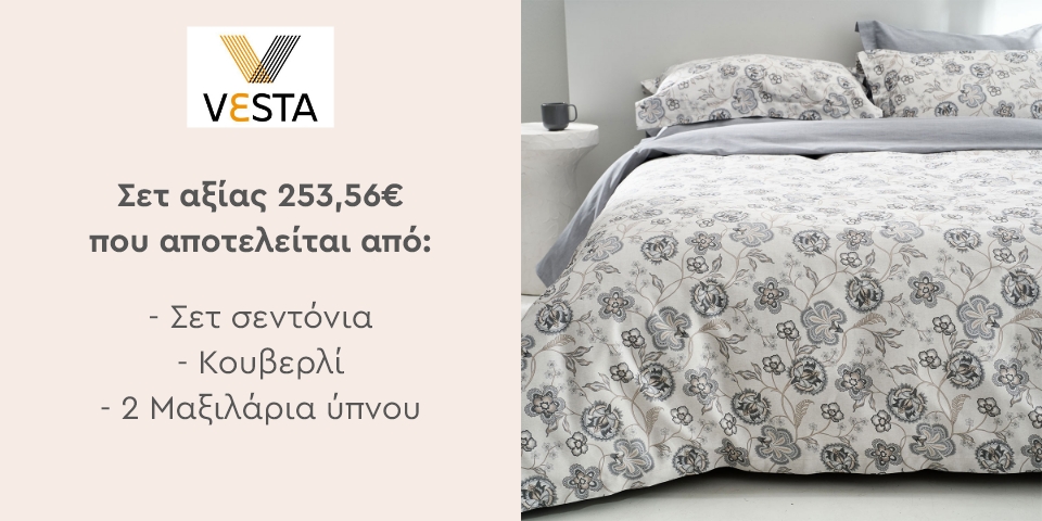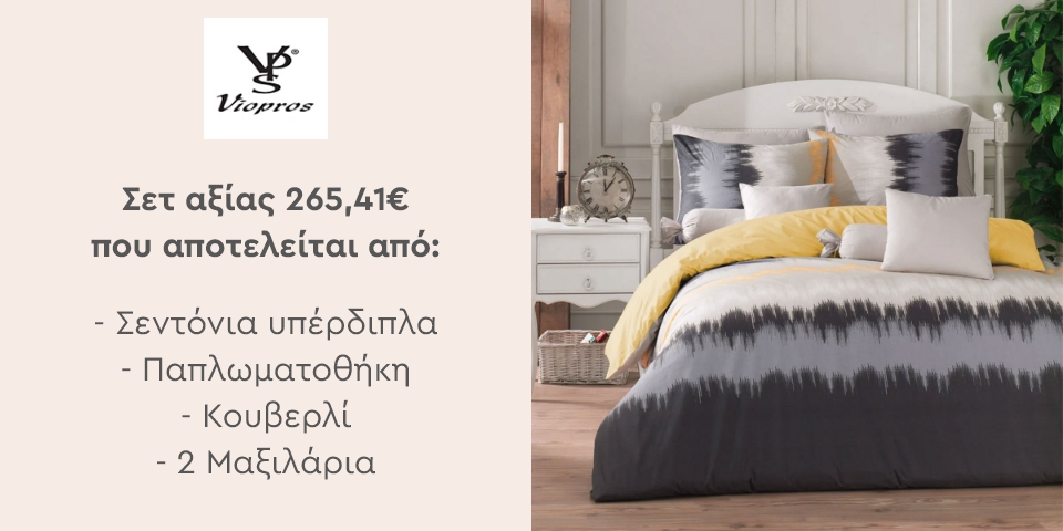 Ένα "φουλ" σετ δώρου που θα αγαπήσεις τόσο την άνοιξη όσο και το καλοκαίρι φέρνει η Viopros. Στο σετ θα βρεις μία καταπληκτική υπέρδιπλη παπλωματοθήκη, ένα κουβερλί υπέρδιπλο 2 όψεων και ένα σετ σεντόνια υπέρδιπλα της ίδιας σειράς! Οπότε διαλέγεις ποιο θα χρησιμοποιείς ανάλογα με τον καιρό. Το σετ δώρου ολοκληρώνεται με 2 μαλακά, πουπουλένια μαξιλάρια με καπιτονέ επένδυση.