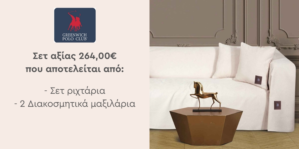 Το σετ ριχταριών της Greenwich Polo Club σε εκρού απόχρωση, θα διακοσμήσει το σαλόνι σου όλες τις εποχές. Μπορείς να το χρησιμοποιήσεις σαν βάση για να κάνεις μοναδικούς συνδυασμούς ανάλογα με τη διάθεσή σου. Το σετ περιλαμβάνει ένα ριχτάρι για τριθέσιο καναπέ, ένα για διθέσιο και ένα διακοσμητικό μαξιλάρι της ίδιας σειράς.