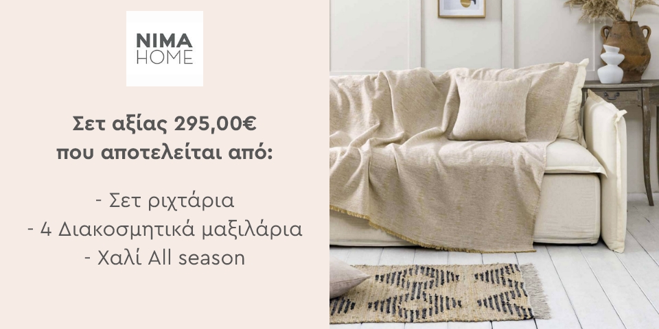 Το σετ δώρου της Nima έρχεται σε γήινες, κομψές αποχρώσεις για να προσδώσει έναν αέρα ηρεμίας στον χώρο σου. Το σετ περιλαμβάνει 2 ριχτάρια (τριθέσιου και διθέσιου καναπέ), καθώς και 4 διακοσμητικά μαξιλάρια της σειράς Benito (με τα γεμίσματά τους), για να απολαύσεις την πιο "ανάλαφρη" εποχή στο σαλόνι σου. Ένα εξωτικό all-season χαλί, το Dume, θα ολοκληρώσει τη χαλαρωτική ατμόσφαιρα του καθιστικού σου!