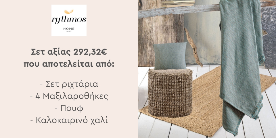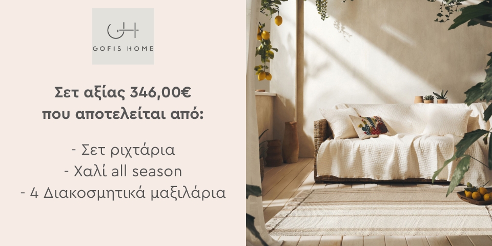 Ανάλαφρο, δροσερό, καλοκαιρινό. Έτσι μπορεί να περιγράψει κάποιος το σχέδιο στο ριχτάρι που επέλεξε η εταιρεία Gofis Home για τον διαγωνισμό του Spitishop. To σετ δώρου περιλαμβάνει ένα ριχτάρι για τριθέσιο καναπέ, ένα για διθέσιο και ένα ριχτάρι πολυθρόνας που θα συνδυαστούν εντυπωσιακά με τα 4 διακοσμητικά μαξιλάρια που τα συμπληρώνουν. Στο σετ περιλαμβάνεται και ένα εκλεπτυσμένο all season χαλί, το Harlow Wet Sand Beige, που είναι σίγουρο ότι θα σε ενθουσιάσει!