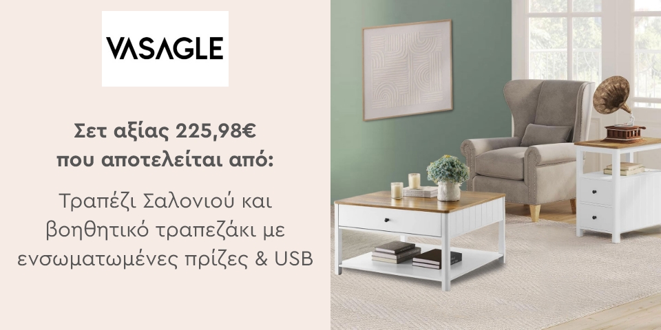 Αυτό το σετ δώρου της Vasagle μας φέρνει στο νου κάτι από γαλλική εξοχή! Ταυτόχρονα όμως, το βοηθητικό τραπεζάκι είναι και "σύγχρονο", αφού διαθέτει ενσωματωμένες πρίζες και USB για να βελτιώσει την καθημερινότητά σου! Το τραπέζι σαλονιού του σετ, περιλαμβάνει 2 συρτάρια και 1 ράφι για να τακτοποιείς όλα σου τα πράγματα!