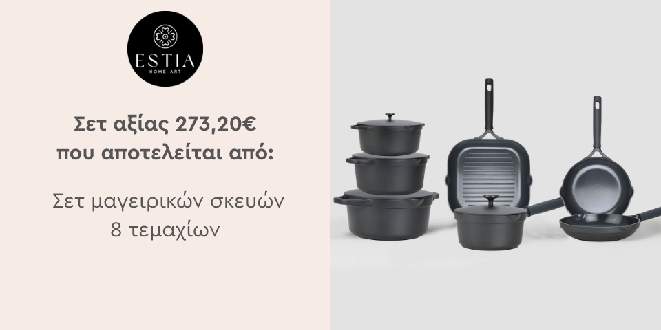 Η Estia έρχεται με ένα αξιοζήλευτο ολοκληρωμένο σετ μαγειρικών σκευών 8 τεμαχίων. Εάν είσαι ο τυχερός που θα αποκτήσει αυτό το σετ δώρου, θα αποκτήσεις 3 τηγάνια κα 3 κατσαρόλες, 1 γαλατιέρα και 1 γκριλιέρα χυτού αλουμινίου! Έτοιμη η "προίκα"!